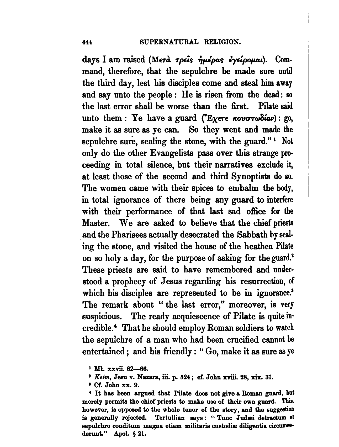 enemies as well as to his friends?(1) Nothing of course could have been more intelligible than his desire to comfort and reassure those who believed in and mourned for him, but to do this by no means excluded a wider manifestation of himself, supposing him to have actually risen from the dead. On the hypothesis that he only rose again and was seen through the yearning and enthusiastic faith of his followers, the reason why he was not seen by others is not hard to find. Yet it might be thought that the object of at once establishing beyond doubt his supernatural mission, and convincing his enemies of their crime, and the Jews of their blindness and folly, was important enough. Had he shown himself to the Chief Priests and elders, and confounded the Pharisees with the vision of him whom they had so cruelly nailed to the accursed tree, how might not the future of his followers have been smoothed, and the faith of many made strong! Or if he had stood again in the Courts of the Roman Procurator, no longer a prisoner buffeted and spat upon, but the glorious Messiah, beyond the reach of Jewish malignity or Roman injustice. But no, he was seen by none but those devoted to him. We shall of course be told by apologists that this also was "for the trial of our faith;" though to anyone who earnestly reflects, it must seem childish to ask men to believe what is beyond their reason, yet conceal the evidence by which reason is supposed to be guided. The reply, however, is clear: for the trial of our faith or for any other reason, it is nevertheless certain that this evidence does not exist.