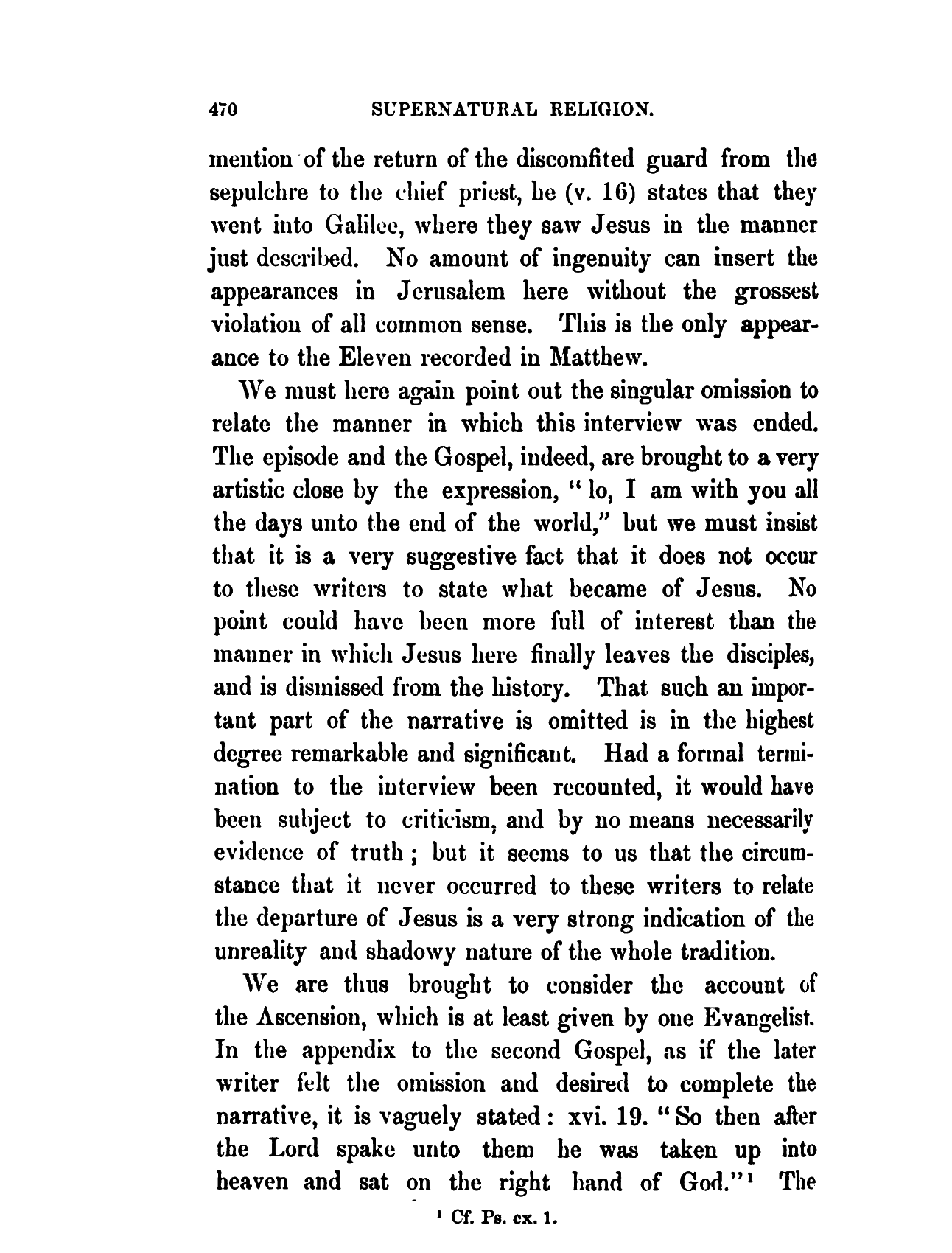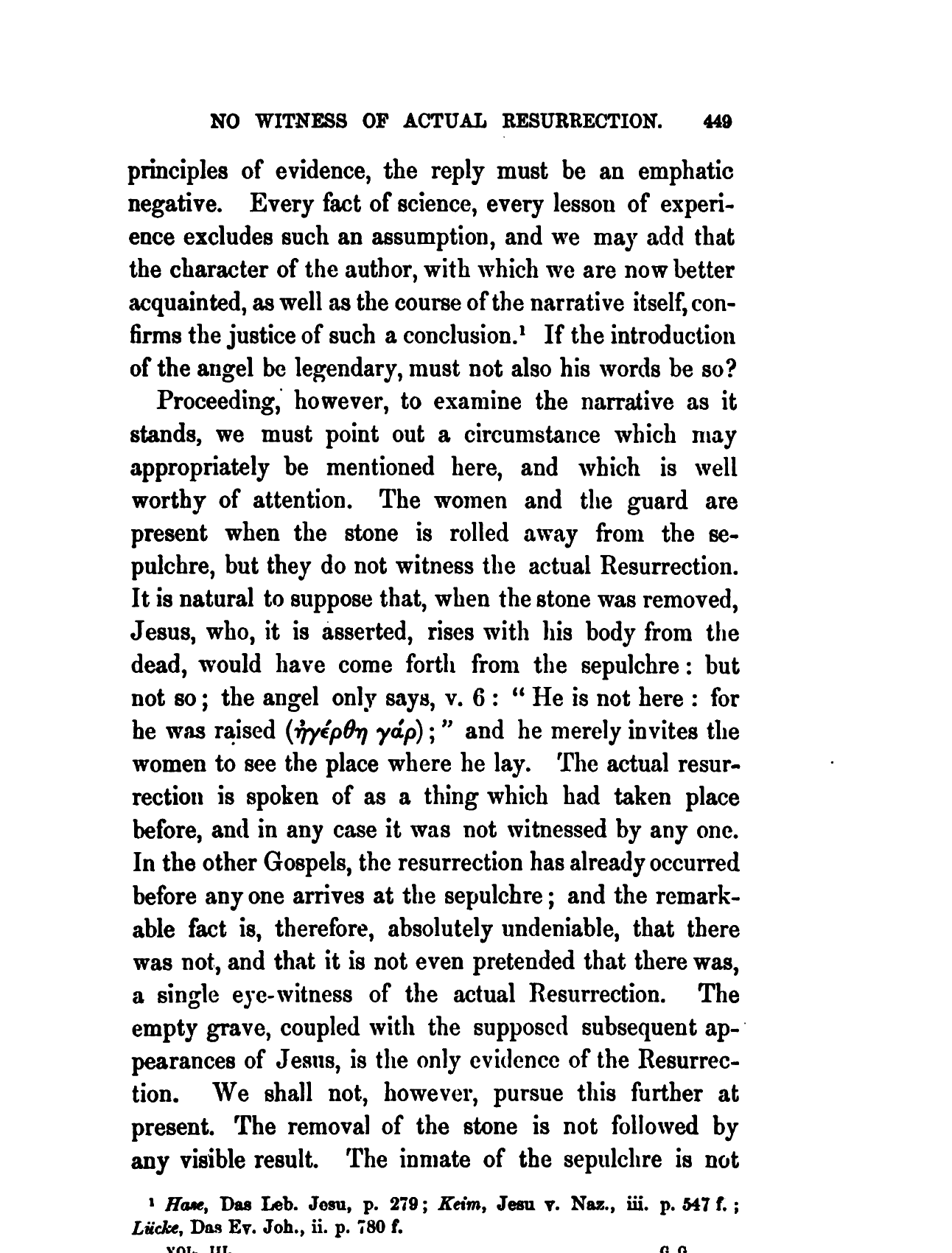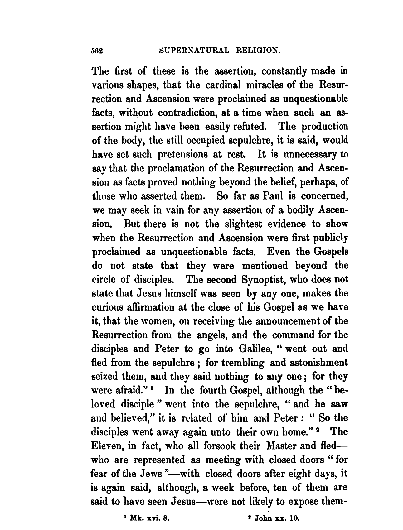 The first of these is the assertion, constantly made in various shapes, that the cardinal miracles of the Resurrection and Ascension were proclaimed as unquestionable facts, without contradiction, at a time when such an assertion might have been easily refuted. The production of the body, the still occupied sepulchre, it is said, would have set such pretensions at rest It is unnecessary to say that the proclamation of the Resurrection and Ascension as facts proved nothing beyond the belief, perhaps, of those who asserted them. So far as Paul is concerned, we may seek in vain for any assertion of a bodily Ascension. But there is not the slightest evidence to show when the Resurrection and Ascension were first publicly proclaimed as unquestionable facts. Even the Gospels do not state that they were mentioned beyond the circle of disciples. The second Synoptist, who does not state that Jesus himself was seen by any one, makes the curious affirmation at the close of his Gospel as we have it, that the women, on receiving the announcement of the Resurrection from the angels, and the command for the disciples and Peter to go into Galilee, "went out and fled from the sepulchre; for trembling and astonishment seized them, and they said nothing to any one; for they were afraid."(1) In the fourth Gospel, although the "beloved disciple" went into the sepulchre, "and he saw and believed," it is related of him and Peter: "So the disciples went away again unto their own home."(2) The Eleven, in fact, who all forsook their Master and fled—who are represented as meeting with closed doors "for fear of the Jews"—with closed doors after eight days, it is again said, although, a week before, ten of them are said to have seen Jesus—were not likely to expose