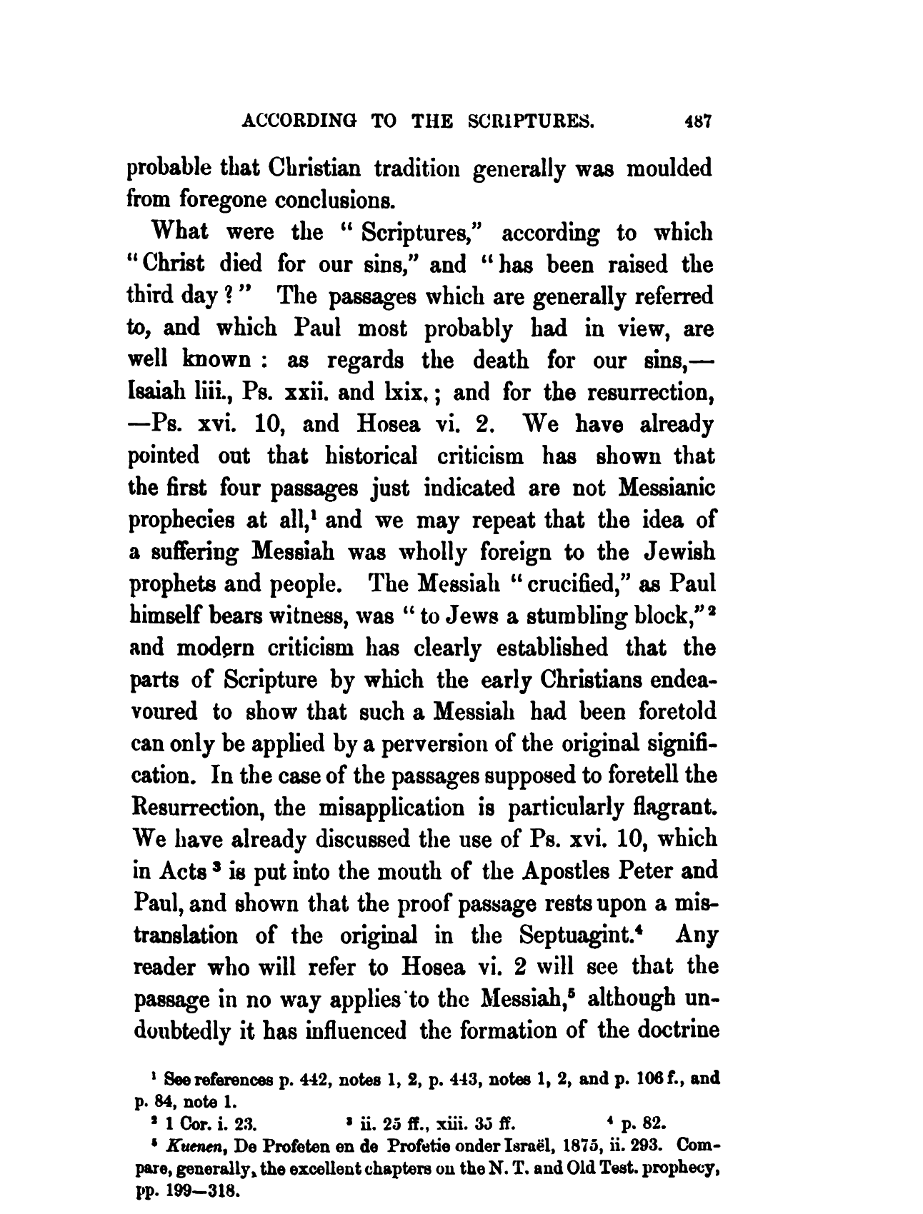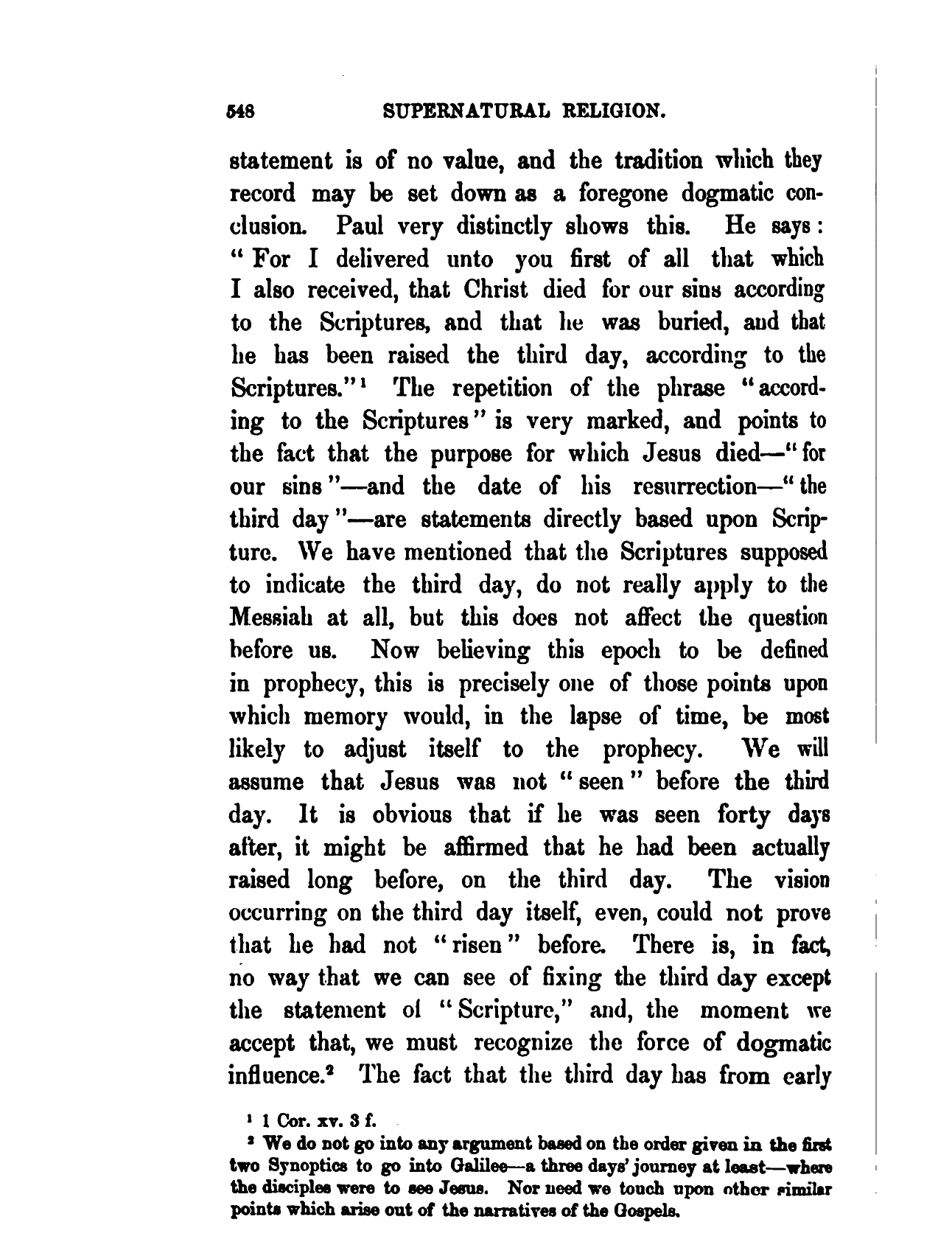 statement is of no value, and the tradition which they record may be set down as a foregone dogmatic con-elusion. Paul very distinctly shows this. He says: "For I delivered unto you first of all that which I also received, that Christ died for our sins according to the Scriptures, and that he was buried, and that he has been raised the third day, according to the Scriptures."(1) The repetition of the phrase "according to the Scriptures" is very marked, and points to the fact that the purpose for which Jesus died—"for our sins"—and the date of his resurrection—"the third day"—are statements directly based upon Scripture. We have mentioned that the Scriptures supposed to indicate the third day, do not really apply to the Messiah at all, but this does not affect the question before us. Now believing this epoch to be defined in prophecy, this is precisely one of those points upon which memory would, in the lapse of time, be most likely to adjust itself to the prophecy. We will assume that Jesus was not "seen" before the third day. It is obvious that if he was seen forty days after, it might be affirmed that he had been actually raised long before, on the third day. The vision occurring on the third day itself, even, could not prove that he had not "risen" before. There is, in fact, no way that we can see of fixing the third day except the statement ol "Scripture," and, the moment we accept that, we must recognize the force of dogmatic influence.(2) The fact that the third day has from early
