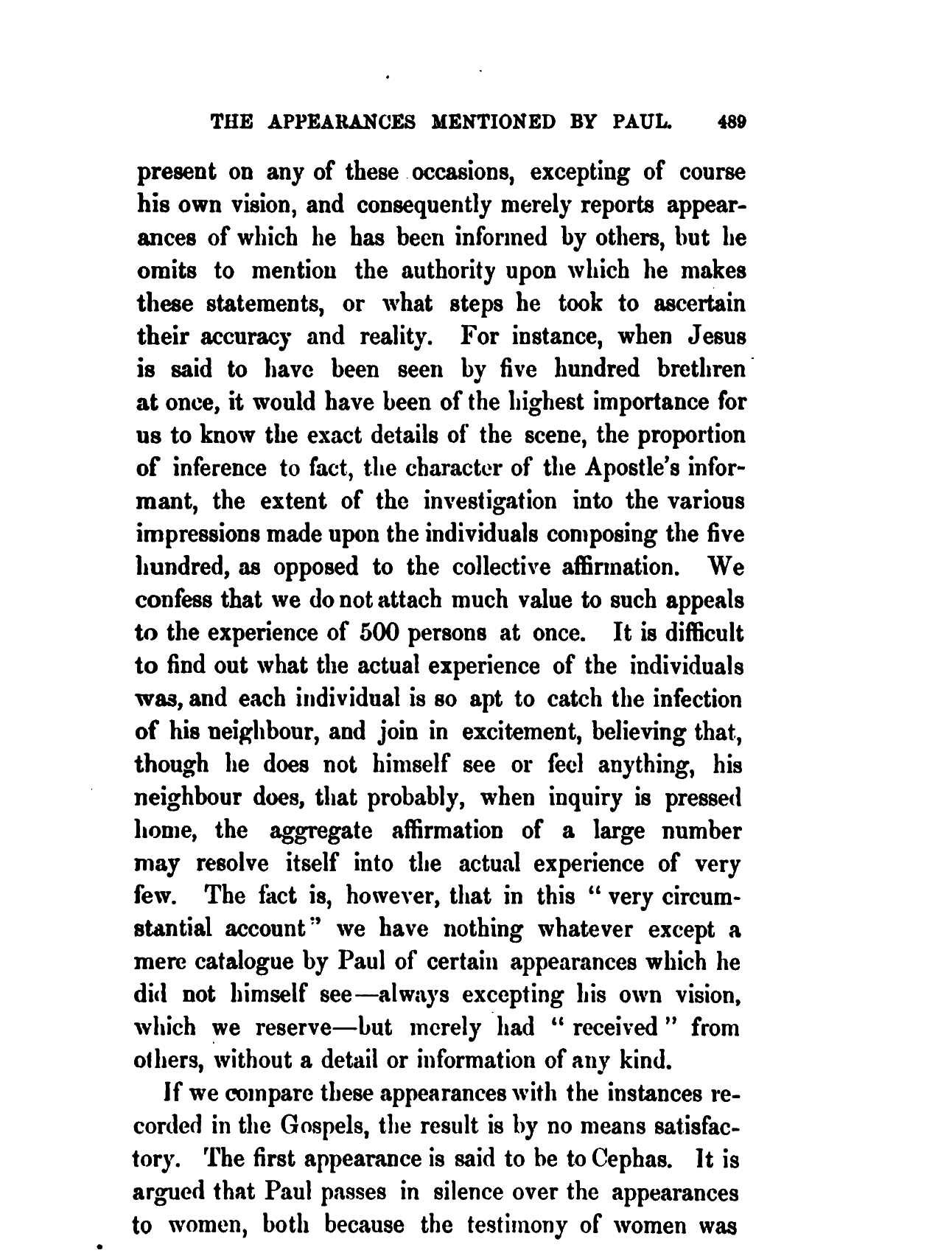 According to Paul it was Peter who first saw the risen Jesus. According to the first and fourth Gospels, the first appearance was to the women, and notably, in the latter, to Mary Magdalene out of whom had been cast "seven devils," and whose temperament probably rendered her unusually susceptible of all such impressions. Did Paul intentionally omit all mention of the appearances to the women, or did he not know of them? In the latter case, we have an instructive light thrown on the Gospel tradition; in the former, the first suggestion