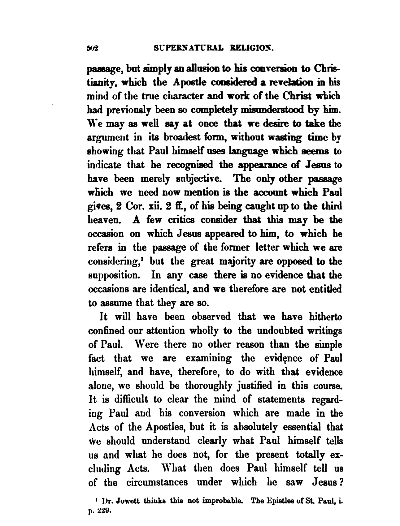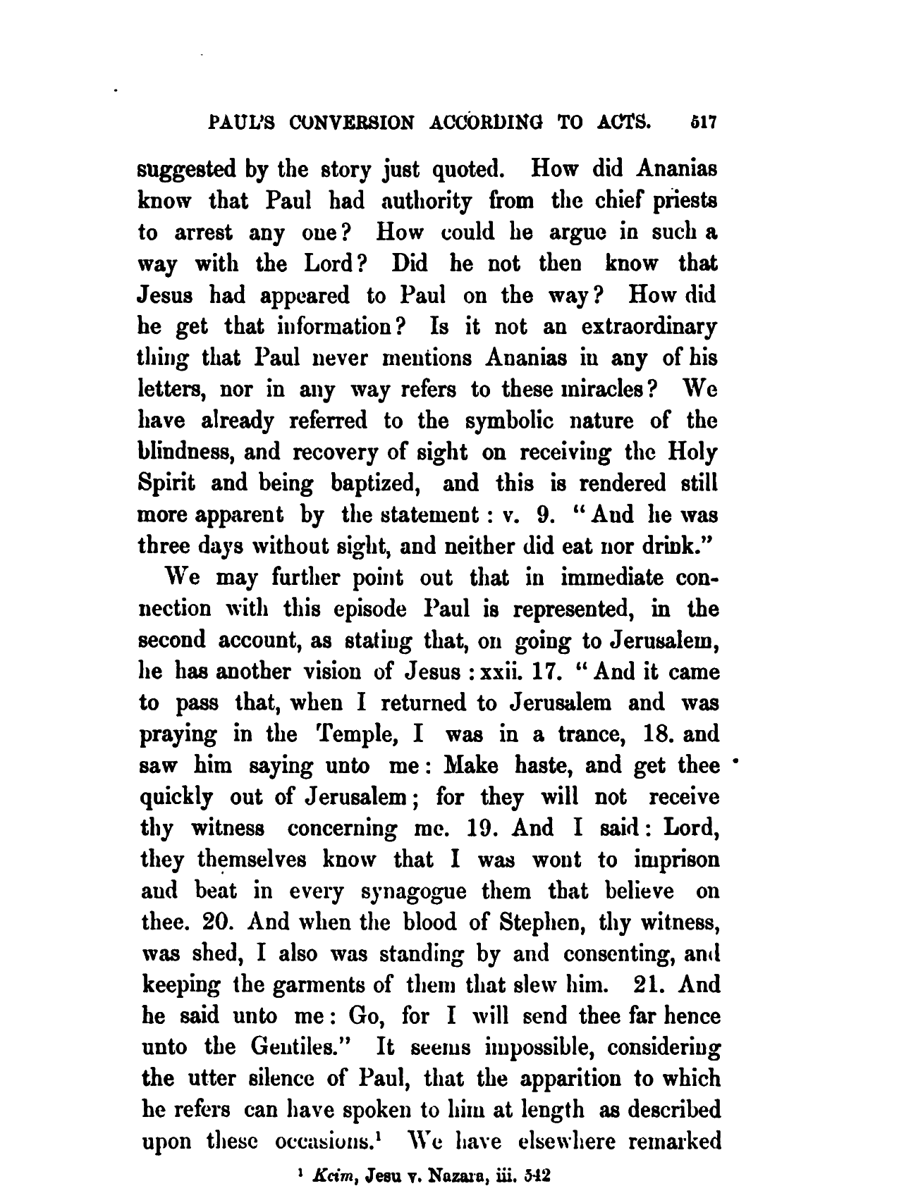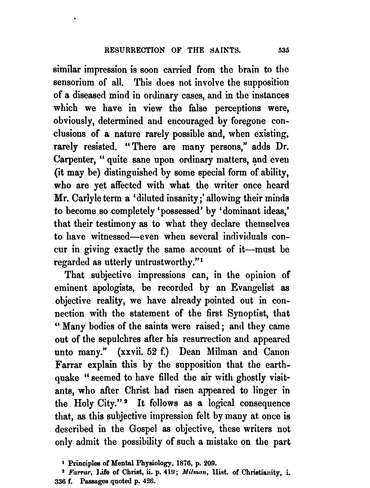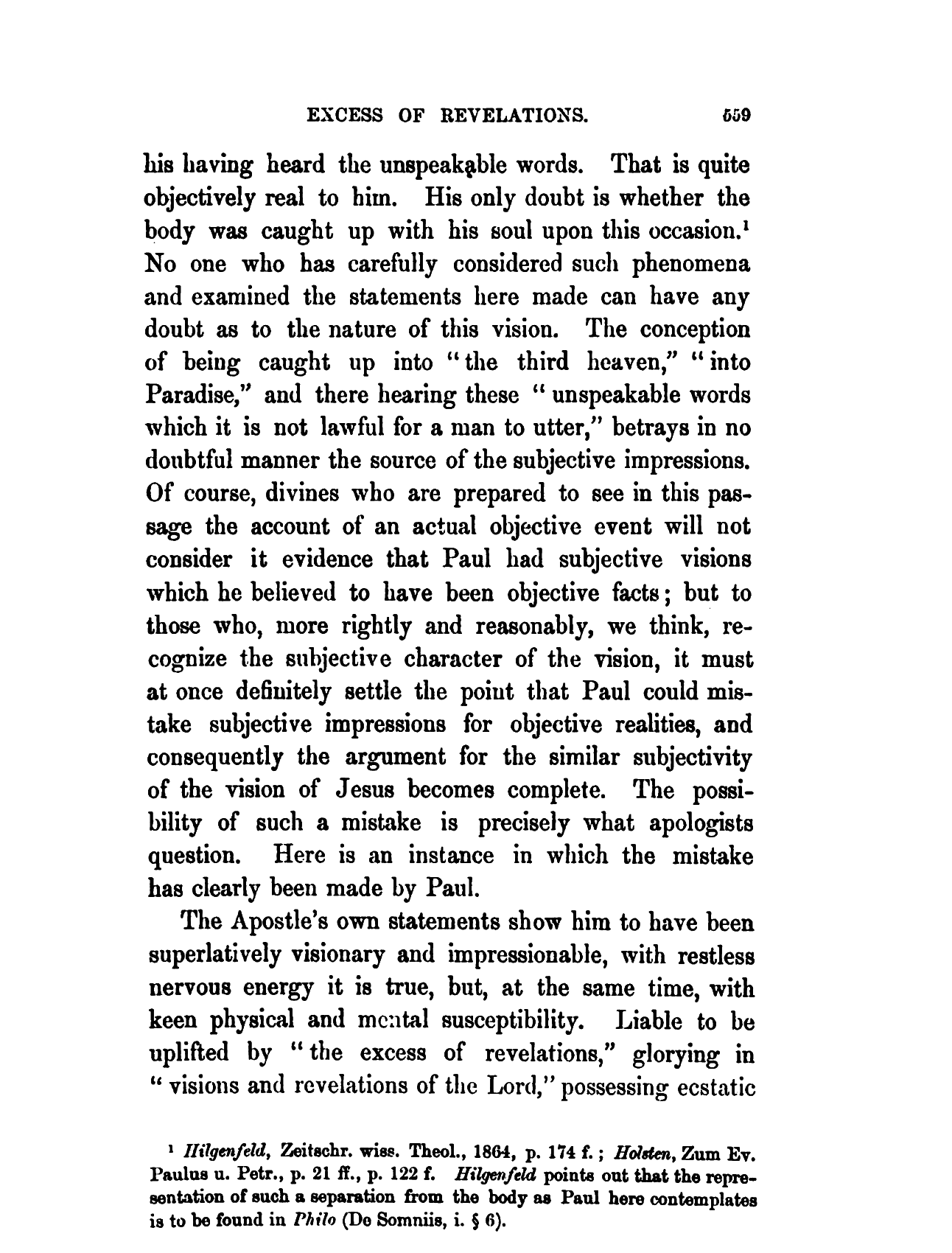 his having heard the unspeakable words. That is quite objectively real to him. His only doubt is whether the body was caught up with his soul upon this occasion.(1) No one who has carefully considered such phenomena and examined the statements here made can have any doubt as to the nature of this vision. The conception of being caught up into "the third heaven," "into Paradise," and there hearing these "unspeakable words which it is not lawful for a man to utter," betrays in no doubtful manner the source of the subjective impressions. Of course, divines who are prepared to see in this passage the account of an actual objective event will not consider it evidence that Paul had subjective visions which he believed to have been objective facts; but to those who, more rightly and reasonably, we think, recognize the subjective character of the vision, it must at once definitely settle the point that Paul could mistake subjective impressions for objective realities, and consequently the argument for the similar subjectivity of the vision of Jesus becomes complete. The possibility of such a mistake is precisely what apologists question. Here is an instance in which the mistake has clearly been made by Paul.