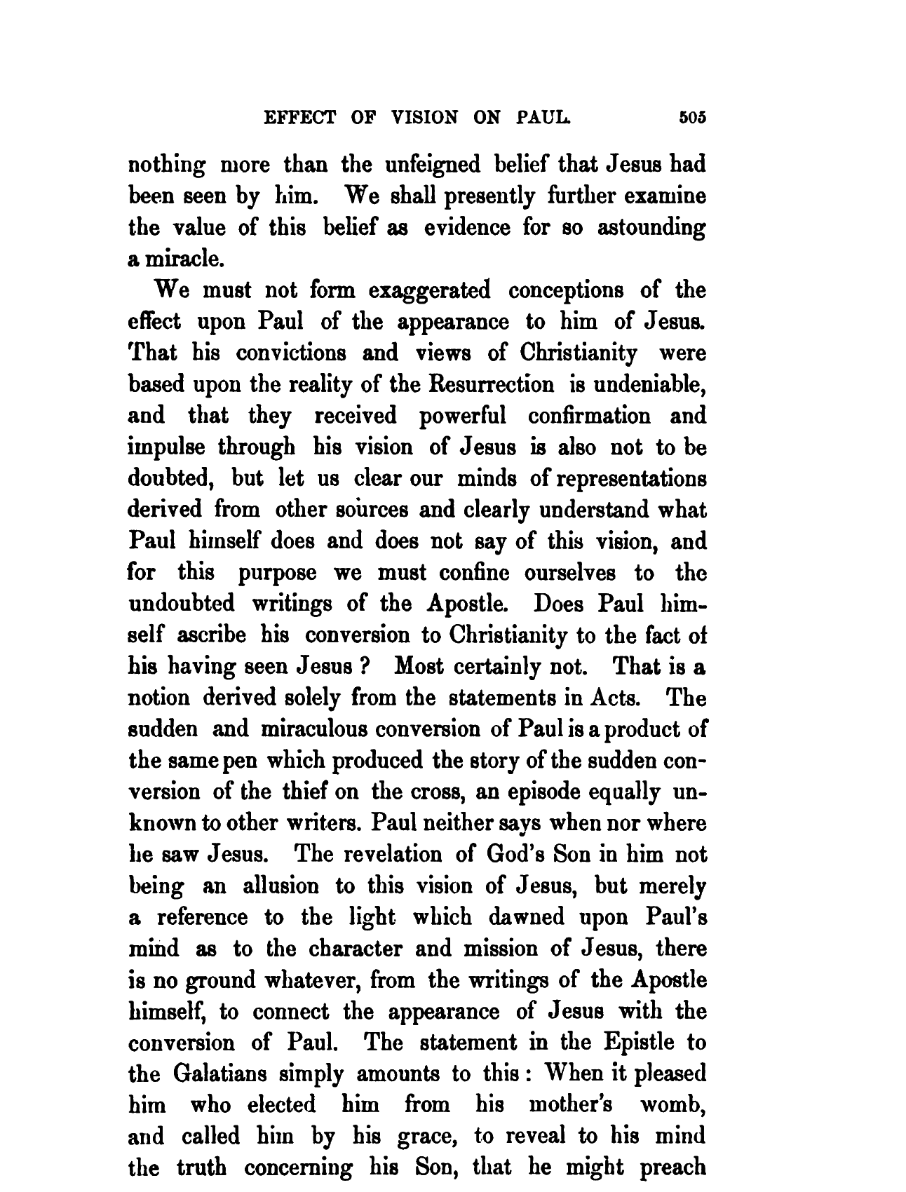 We must now proceed to show that the vision of Paul is satisfactorily explained by the same hypothesis.(2) We have already proved that there is no evidence of any value that Paul's conversion was due to his having seen Jesus in a manner which he believed to be objective and supernatural. To represent the arch persecutor Paul transformed in a moment, by a miraculous vision of Jesus, into the Apostle of the Gentiles was highly characteristic of the author of