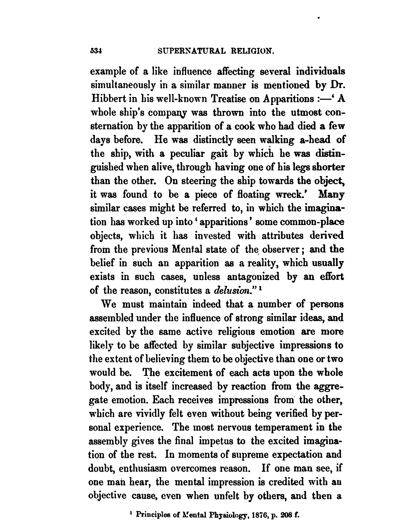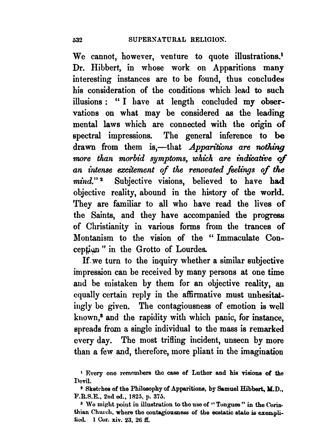 Whatever definition be given of miracles, such exceptional phenomena must at least be antecedently incredible. In the absence of absolute knowledge, human belief must be guided by the balance of evidence, and it is obvious that the evidence for the uniformity of the order of nature, which is derived from universal experience, must be enormously greater than can be the testimony for my alleged exception to it. On the other hand, universal experience prepares us to consider mistakes of the senses, imperfect observation and erroneous inference as not only possible, but eminently probable on the part of the witnesses of phenomena, even when they are perfectly honest and truthful, and more especially so when such disturbing causes as religious excitement and superstition are present. When the report of the original witnesses only reaches us indirectly and through the medium of tradition, the probability of error is further increased. Thus the allegation of miracles is discredited, both positively by the invariability of the order of nature, and negatively by the fallibility of human observation and testimony. The history of miraculous pretension in the world, and the circumstances attending the special exhibition of it which we are examining, suggest natural explanations of the reported facts which wholly remove them from the region of the supernatural.