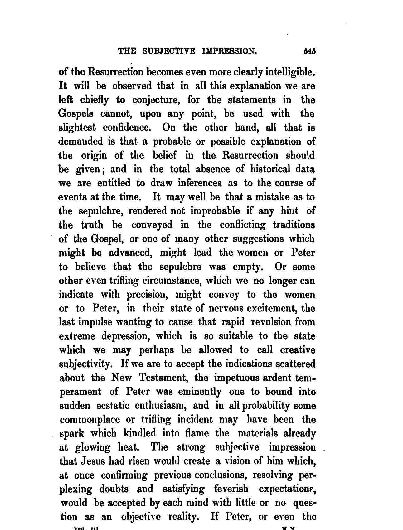 of the Resurrection becomes even more clearly intelligible. It will be observed that in all this explanation we are left chiefly to conjecture, for the statements in the Gospels cannot, upon any point, be used with the slightest confidence. On the other hand, all that is demanded is that a probable or possible explanation of the origin of the belief in the Resurrection should be given; and in the total absence of historical data we are entitled to draw inferences as to the course of events at the time. It may well be that a mistake as to the sepulchre, rendered not improbable if any hint of the truth be conveyed in the conflicting traditions of the Gospel, or one of many other suggestions which might be advanced, might lead the women or Peter to believe that the sepulchre was empty. Or some other even trifling circumstance, which we no longer can indicate with precision, might convey to the women or to Peter, in their state of nervous excitement, the last impulse wanting to cause that rapid revulsion from extreme depression, which is so suitable to the state which we may perhaps be allowed to call creative subjectivity. If we are to accept the indications scattered about the New Testament, the impetuous ardent temperament of Peter was eminently one to bound into sudden ecstatic enthusiasm, and in all probability some commonplace or trifling incident may have been the spark which kindled into flame the materials already at glowing heat. The strong subjective impression that Jesus had risen would create a vision of him which, at once confirming previous conclusions, resolving perplexing doubts and satisfying feverish expectations, would be accepted by each mind with little or no question as an objective reality. If Peter, or even the