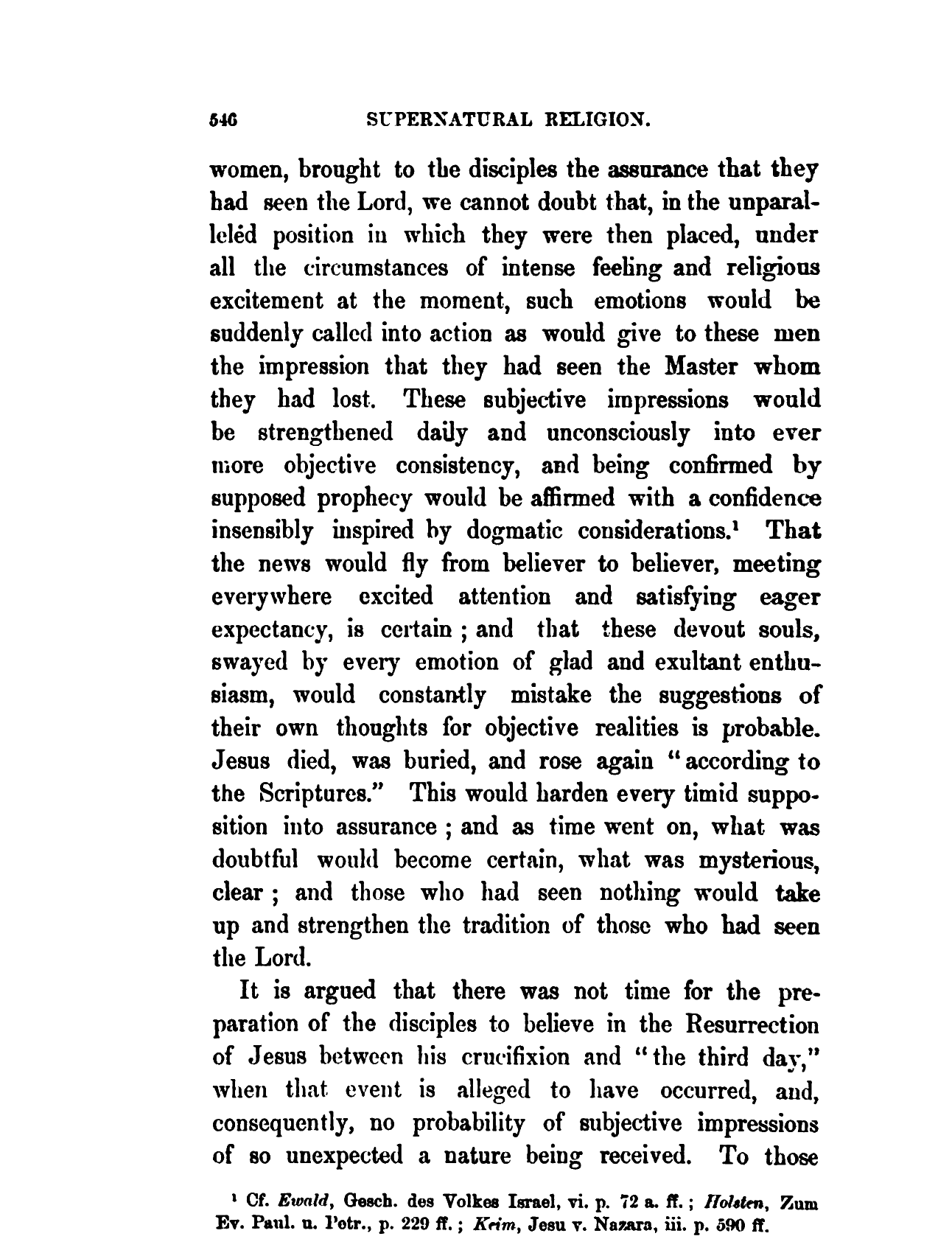 It is argued that there was not time for the preparation of the disciples to believe in the Resurrection of Jesus between his crucifixion and "the third day," when that event is alleged to have occurred, and, consequently, no probability of subjective impressions of so unexpected a nature being received. To those
