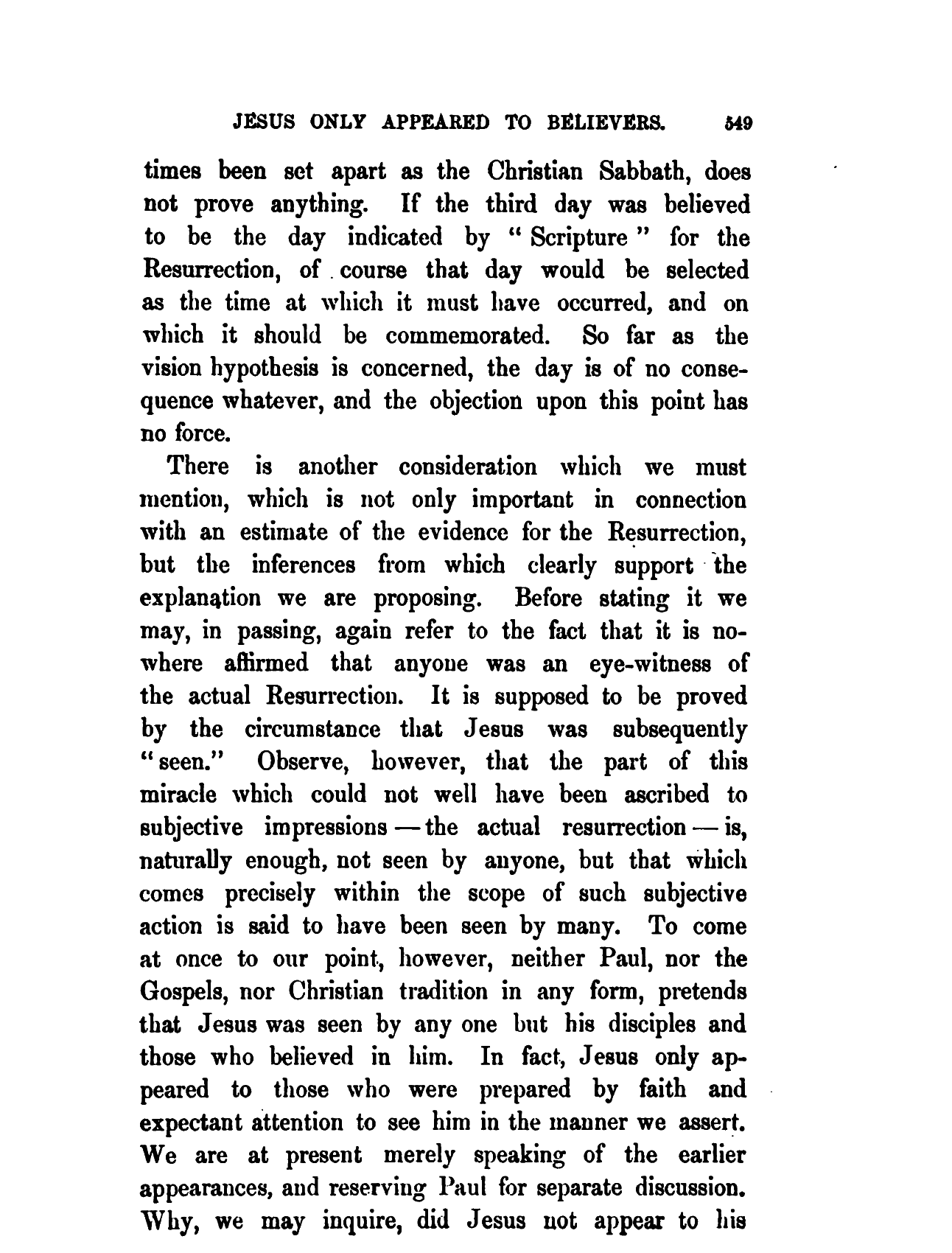 times been set apart as the Christian Sabbath, does not prove anything. If the third day was believed to be the day indicated by "Scripture" for the Resurrection, of course that day would be selected as the time at which it must have occurred, and on which it should be commemorated. So far as the vision hypothesis is concerned, the day is of no consequence whatever, and the objection upon this point has no force.