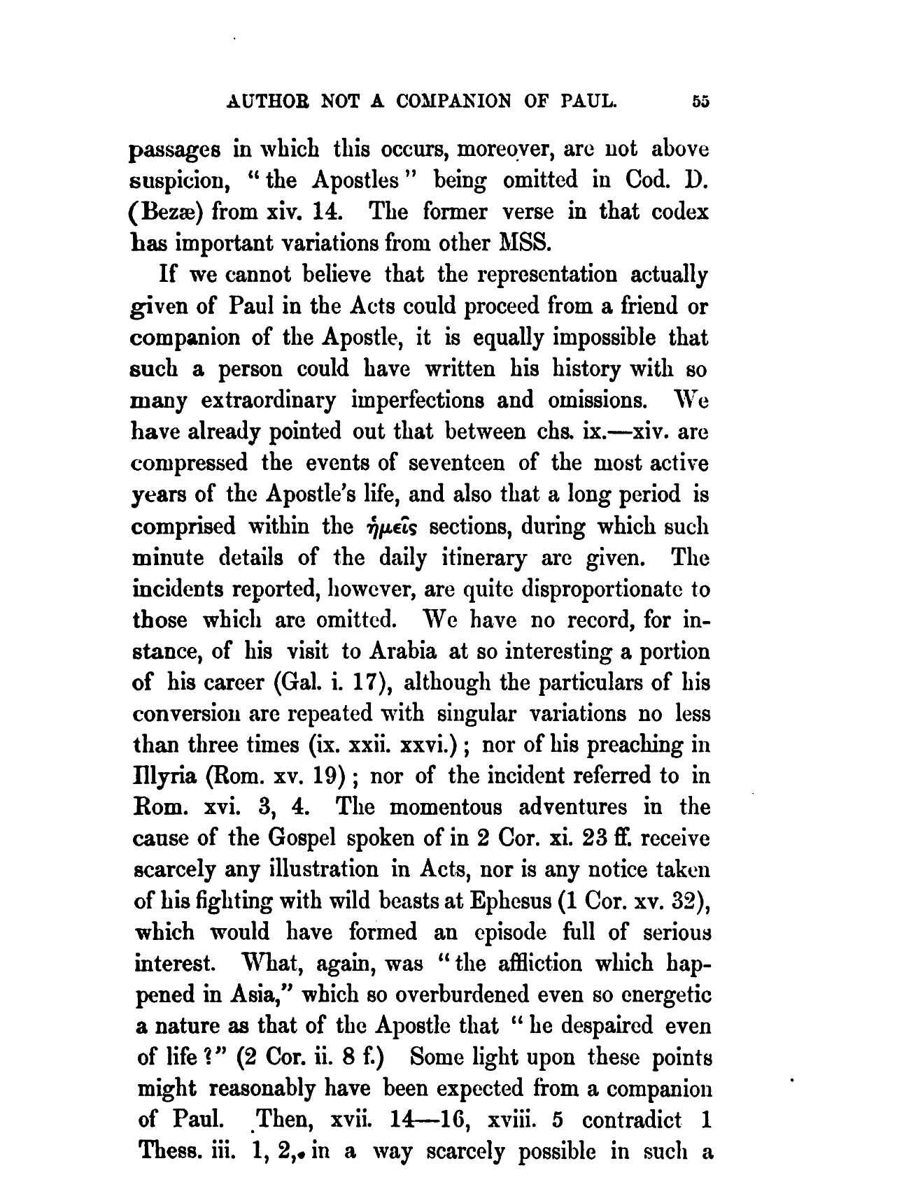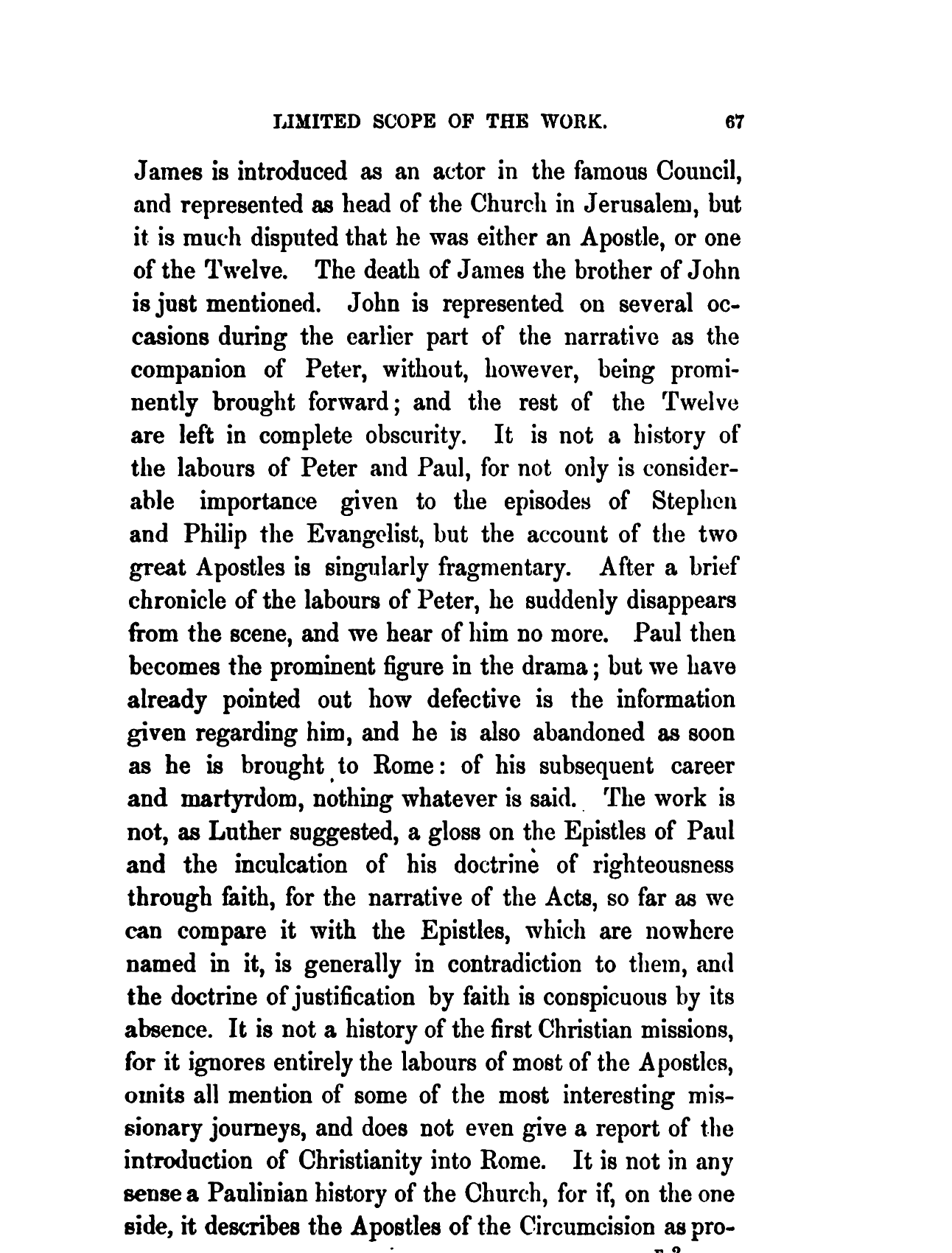 the unknown writer beyond that of merely testifying to the currency of such a tradition, and even the few words quoted show how uncritical he was. Nothing could be less appropriate to the work before us than the assertion that it contains the Acts of all the Apostles, for it must be apparent to all, and we shall hereafter have to refer to the point, that it very singularly omits all record of the acts of most of the apostles, occupies itself chiefly with those of Peter and Paul, and devotes considerable attention to Stephen and to others who were not apostles at all. We shall further have occasion to show that the writer does anything but confine himself to the events of which he was an eye-witness, and we may merely remark, in passing, as a matter. which scarcely concerns us here, that the instances given by the unknown writer of the fragment to support his assertion are not only irrelevant, but singularly devoid themselves of historical attestation.