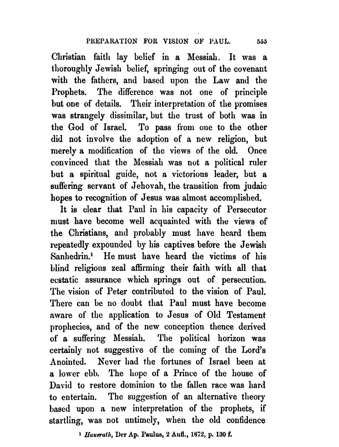 It is clear that Paul in his capacity of Persecutor must have become well acquainted with the views of the Christians, and probably must have heard them repeatedly expounded by his captives before the Jewish Sanhedrin.1 He must have heard the victims of his blind religious zeal affirming their faith with all that ecstatic assurance which springs out of persecution. The vision of Peter contributed to the vision of Paul. There can be no doubt that Paul must have become aware of the application to Jesus of Old Testament prophecies, and of the new conception thence derived of a suffering Messiah. The political horizon was certainly not suggestive of the coming of the Lord's Anointed. Never had the fortunes of Israel been at a lower ebb. The hope of a Prince of the house of David to restore dominion to the fallen race was hard to entertain. The suggestion of an alternative theory based upon a new interpretation of the prophets, if startling, was not untimely, when the old confidence