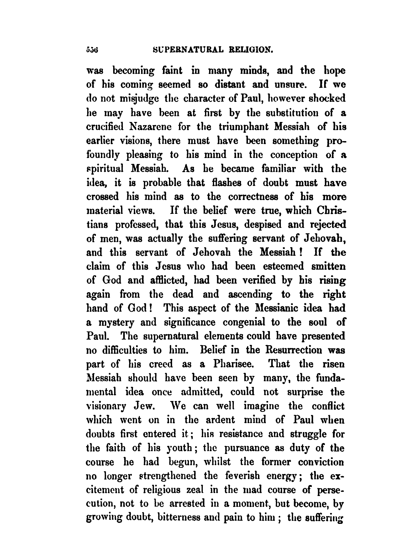 was becoming faint in many minds, and the hope of his coming seemed so distant and unsure. If we do not misjudge the character of Paul, however shocked he may have been at first by the substitution of a crucified Nazarene for the triumphant Messiah of his earlier visions, there must have been something profoundly pleasing to his mind in the conception of a spiritual Messiah. As he became familiar with the idea, it is probable that flashes of doubt must have crossed his mind as to the correctness of his more material views. If the belief were true, which Christians professed, that this Jesus, despised and rejected of men, was actually the suffering servant of Jehovah, and this servant of Jehovah the Messiah! If the claim of this Jesus who had been esteemed smitten of God and afflicted, had been verified by his rising again from the dead and ascending to the right hand of God! This aspect of the Messianic idea had a mystery and significance congenial to the soul of Paul. The supernatural elements could have presented no difficulties to him. Belief in the Resurrection was part of his creed as a Pharisee. That the risen Messiah should have been seen by many, the fundamental idea once admitted, could not surprise the visionary Jew. We can well imagine the conflict which went on in the ardent mind of Paul when doubts first entered it; his resistance and struggle for the faith of his youth; the pursuance as duty of the course he had begun, whilst the former conviction no longer strengthened the feverish energy; the excitement of religious zeal in the mad course of persecution, not to be arrested in a moment, but become, by growing doubt, bitterness and pain to him; the suffering