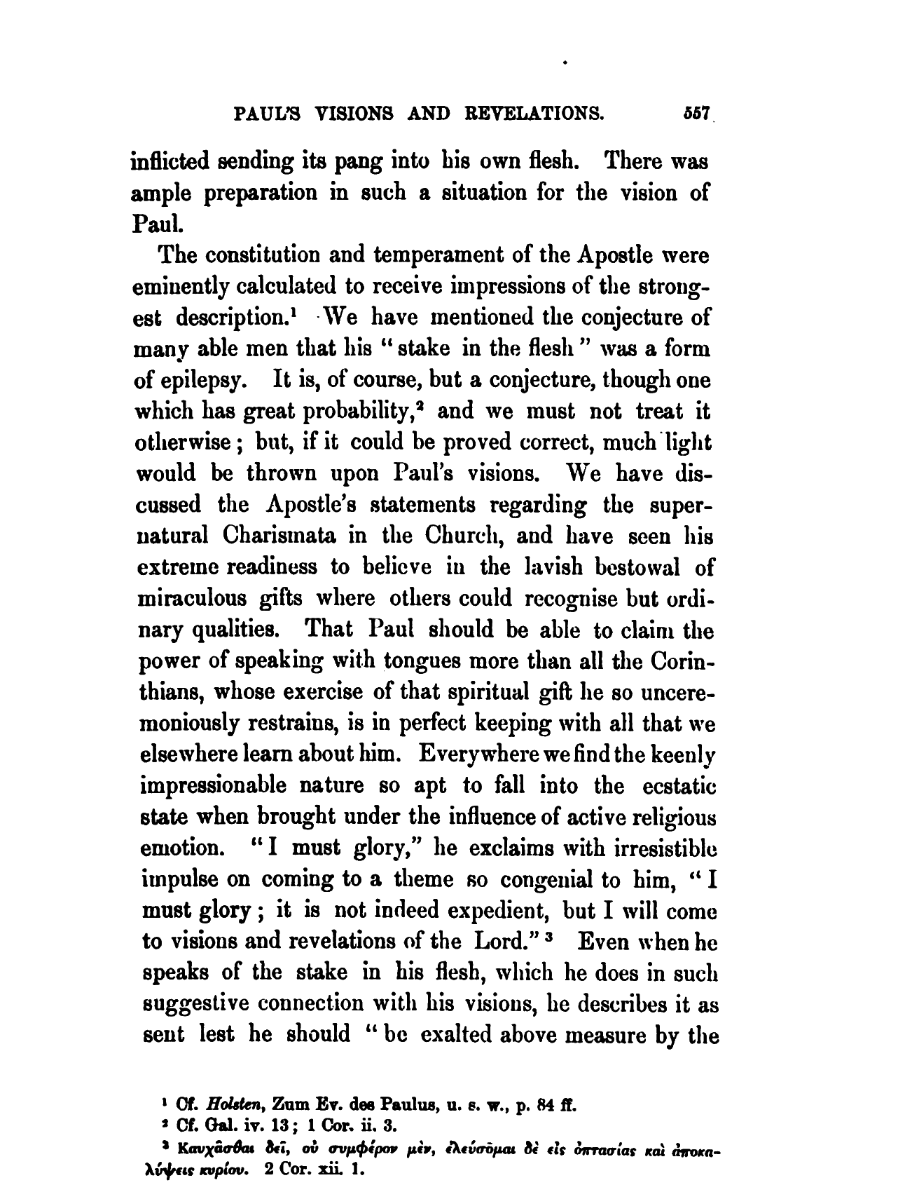 The constitution and temperament of the Apostle were eminently calculated to receive impressions of the strongest description.(1) We have mentioned the conjecture of many able men that his "stake in the flesh" was a form of epilepsy. It is, of course, but a conjecture, though one which has great probability,(2) and we must not treat it otherwise; but, if it could be proved correct, much light would be thrown upon Paul's visions. We have discussed the Apostle's statements regarding the supernatural Charismata in the Church, and have seen his extreme readiness to believe in the lavish bestowal of miraculous gifts where others could recognise but ordinary qualities. That Paul should be able to claim the power of speaking with tongues more than all the Corinthians, whose exercise of that spiritual gift he so unceremoniously restrains, is in perfect keeping with all that we elsewhere learn about him. Everywhere we find the keenly impressionable nature so apt to fall into the ecstatic state when brought under the influence of active religious emotion. "I must glory," he exclaims with irresistible impulse on coming to a theme so congenial to him, "I must glory; it is not indeed expedient, but I will come to visions and revelations of the Lord."(3) Even when he speaks of the stake in his flesh, which he does in such suggestive connection with his visions, he describes it as sent lest he should "be exalted above measure by the
