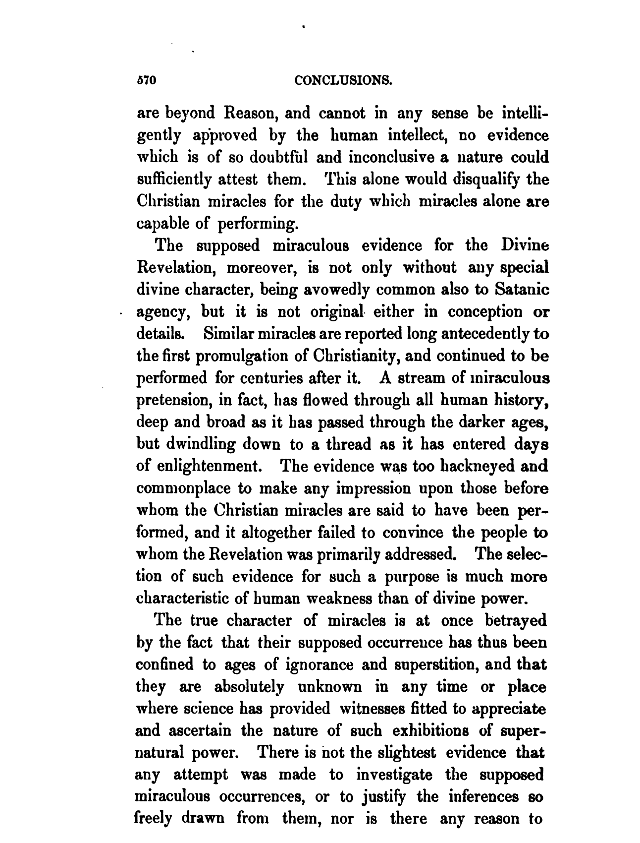 The supposed miraculous evidence for the Divine Revelation, moreover, is not only without any special divine character, being avowedly common also to Satanic agency, but it is not original either in conception or details. Similar miracles are reported long antecedently to the first promulgation of Christianity, and continued to be performed for centuries after it. A stream of miraculous pretension, in fact, has flowed through all human history, deep and broad as it has passed through the darker ages, but dwindling down to a thread as it has entered days of enlightenment. The evidence was too hackneyed and commonplace to make any impression upon those before whom the Christian miracles are said to have been performed, and it altogether failed to convince the people to whom the Revelation was primarily addressed. The selection of such evidence for such a purpose is much more characteristic of human weakness than of divine power.