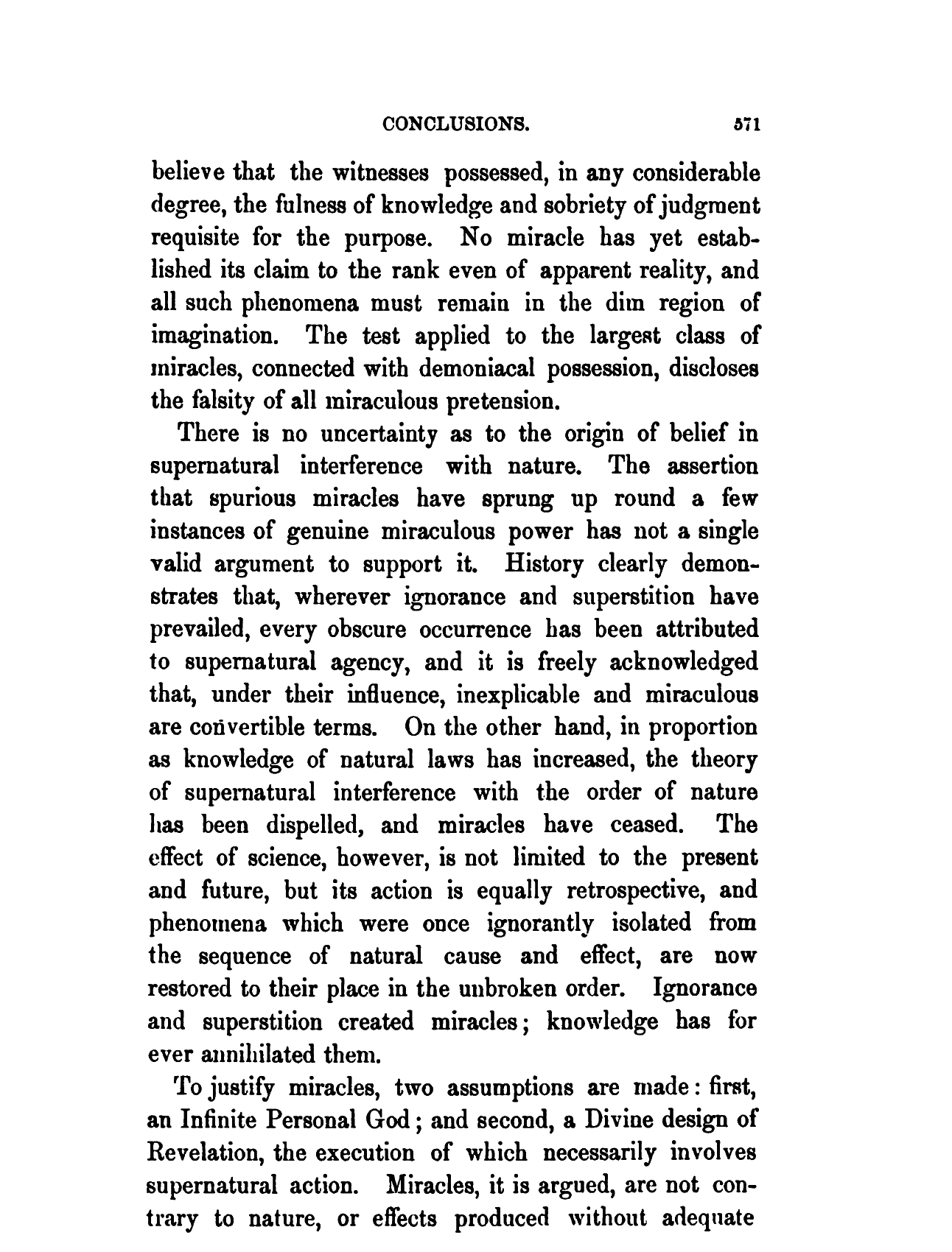 There is no uncertainty as to the origin of belief in supernatural interference with nature. The assertion that spurious miracles have sprung up round a few instances of genuine miraculous power has not a single valid argument to support it. History clearly demonstrates that, wherever ignorance and superstition have prevailed, every obscure occurrence has been attributed to supernatural agency, and it is freely acknowledged that, under their influence, inexplicable and miraculous are convertible terms. On the other hand, in proportion as knowledge of natural laws has increased, the theory of supernatural interference with the order of nature has been dispelled, and miracles have ceased. The effect of science, however, is not limited to the present and future, but its action is equally retrospective, and phenomena which were once ignorantly isolated from the sequence of natural cause and effect, are now restored to their place in the unbroken order. Ignorance and superstition created miracles; knowledge has for ever annihilated them.