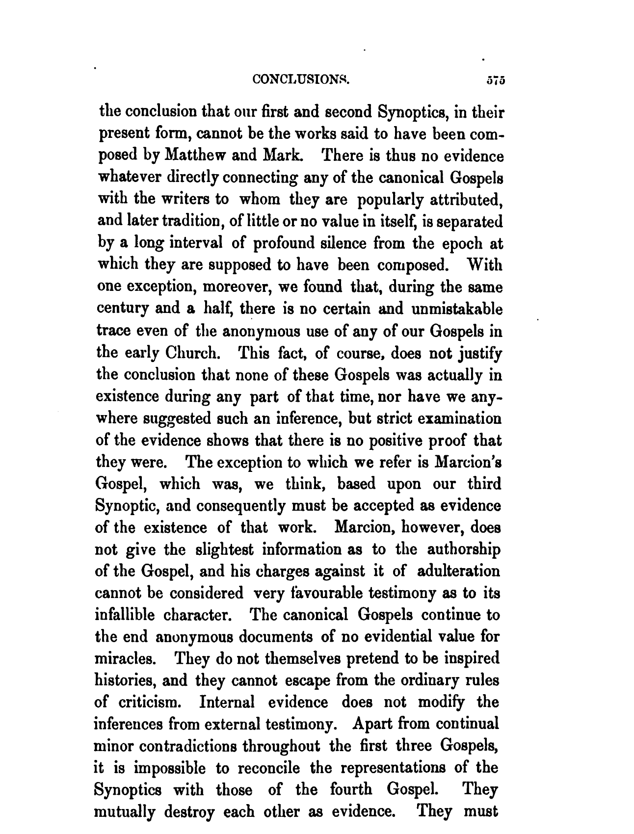 the conclusion that our first and second Synoptics, in their present form, cannot be the works said to have been composed by Matthew and Mark. There is thus no evidence whatever directly connecting any of the canonical Gospels with the writers to whom they are popularly attributed, and later tradition, of little or no value in itself, is separated by a long interval of profound silence from the epoch at which they are supposed to have been composed. With one exception, moreover, we found that, during the same century and a half, there is no certain and unmistakable trace even of the anonymous use of any of our Gospels in the early Church. This fact, of course, does not justify the conclusion that none of these Gospels was actually in existence during any part of that time, nor have we anywhere suggested such an inference, but strict examination of the evidence shows that there is no positive proof that they were. The exception to which we refer is Marcion's Gospel, which was, we think, based upon our third Synoptic, and consequently must be accepted as evidence of the existence of that work. Marcion, however, does not give the slightest information as to the authorship of the Gospel, and his charges against it of adulteration cannot be considered very favourable testimony as to its infallible character. The canonical Gospels continue to the end anonymous documents of no evidential value for miracles. They do not themselves pretend to be inspired histories, and they cannot escape from the ordinary rules of criticism. Internal evidence does not modify the inferences from external testimony. Apart from continual minor contradictions throughout the first three Gospels, it is impossible to reconcile the representations of the Synoptics with those of the fourth Gospel. They mutually destroy each other as evidence. They must