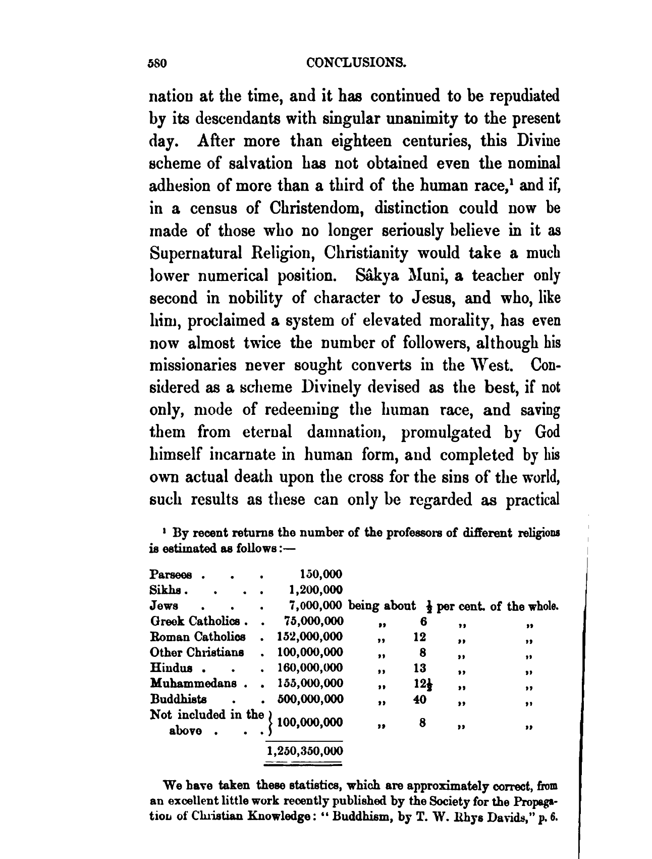 nation at the time, and it has continued to be repudiated by its descendants with singular unanimity to the present day. After more than eighteen centuries, this Divine scheme of salvation has not obtained even the nominal adhesion of more than a third of the human race,(1) and if, in a census of Christendom, distinction could now be made of those who no longer seriously believe in it as Supernatural Religion, Christianity would take a much lower numerical position. Sakya Muni, a teacher only second in nobility of character to Jesus, and who, like him, proclaimed a system of elevated morality, has even now almost twice the number of followers, although his missionaries never sought converts in the West. Considered as a scheme Divinely devised as the best, if not only, mode of redeeming the human race, and saving them from eternal damnation, promulgated by God himself incarnate in human form, and completed by his own actual death upon the cross for the sins of the world, such results as these can only be regarded as practical