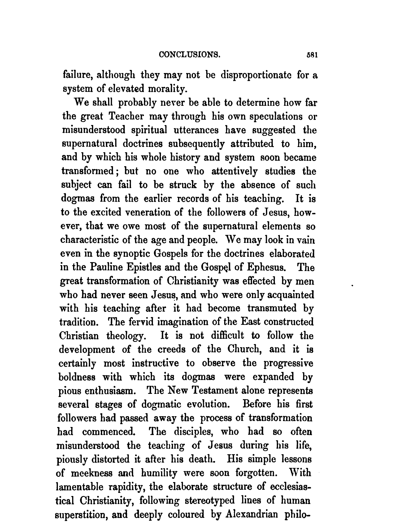 We shall probably never be able to determine how far the great Teacher may through his own speculations or misunderstood spiritual utterances have suggested the supernatural doctrines subsequently attributed to him, and by which his whole history and system soon became transformed; but no one who attentively studies the subject can fail to be struck by the absence of such dogmas from the earlier records of his teaching. It is to the excited veneration of the followers of Jesus, however, that we owe most of the supernatural elements so characteristic of the age and people. We may look in vain even in the synoptic Gospels for the doctrines elaborated in the Pauline Epistles and the Gospel of Ephesus. The great transformation of Christianity was effected by men who had never seen Jesus, and who were only acquainted with his teaching after it had become transmuted by tradition. The fervid imagination of the East constructed Christian theology. It is not difficult to follow the development of the creeds of the Church, and it is certainly most instructive to observe the progressive boldness with which its dogmas were expanded by pious enthusiasm. The New Testament alone represents several stages of dogmatic evolution. Before his first followers had passed away the process of transformation had commenced. The disciples, who had so often misunderstood the teaching of Jesus during his life, piously distorted it after his death. His simple lessons of meekness and humility were soon forgotten. With lamentable rapidity, the elaborate structure of ecclesiastical Christianity, following stereotyped lines of human superstition, and deeply coloured by Alexandrian