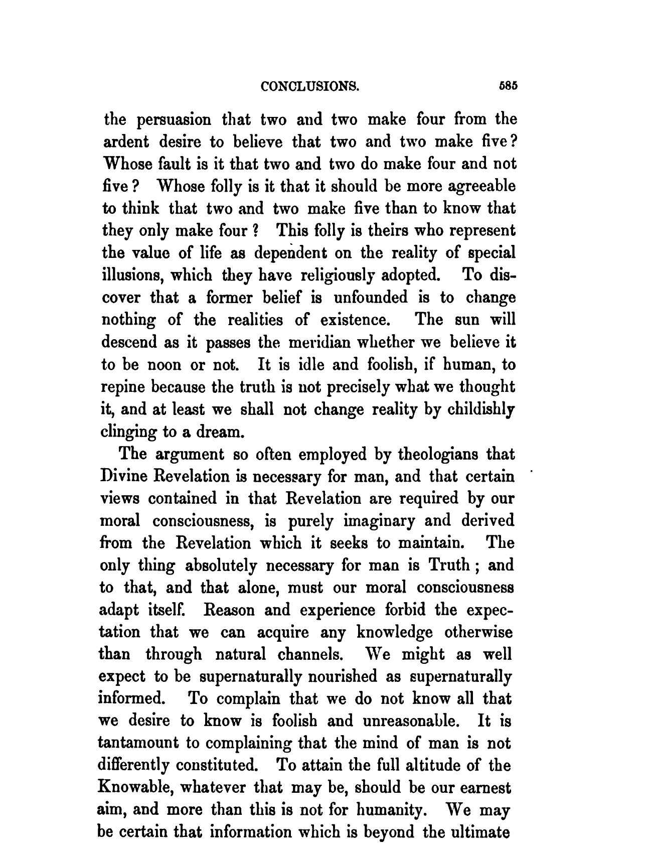 The argument so often employed by theologians that Divine Revelation is necessary for man, and that certain views contained in that Revelation are required by our moral consciousness, is purely imaginary and derived from the Revelation which it seeks to maintain. The only thing absolutely necessary for man is Truth; and to that, and that alone, must our moral consciousness adapt itself. Reason and experience forbid the expectation that we can acquire any knowledge otherwise than through natural channels. We might as well expect to be supernaturally nourished as supernaturally informed. To complain that we do not know all that we desire to know is foolish and unreasonable. It is tantamount to complaining that the mind of man is not differently constituted. To attain the full altitude of the Knowable, whatever that may be, should be our earnest aim, and more than this is not for humanity. We may be certain that information which is beyond the ultimate