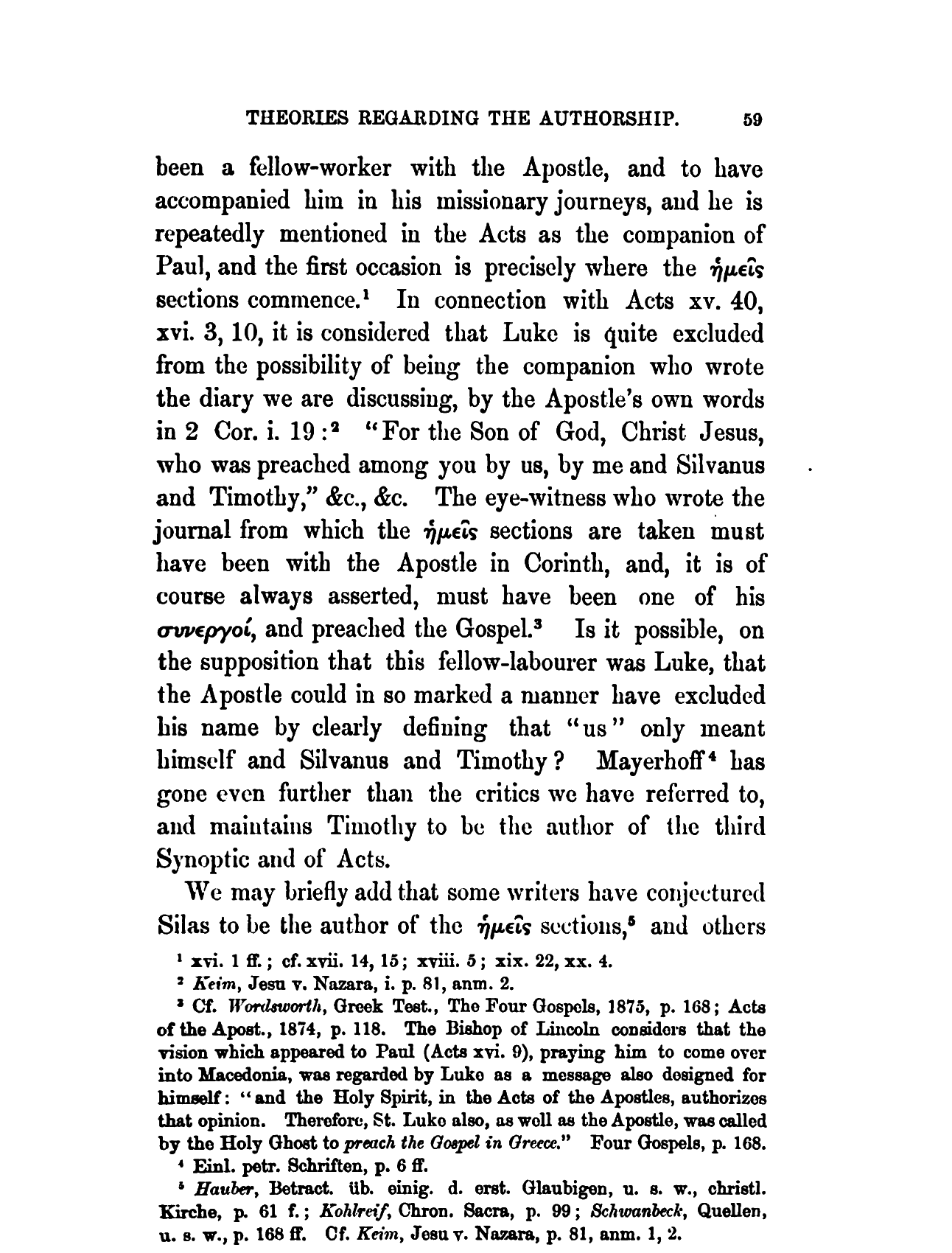 If we turn to the document itself, we find that it professes to be the second portion of a work written for the information of an unknown person named Theophilus, the first part being the Gospel, which, in our canonical New Testament, bears the name of "Gospel according to Luke." The narrative is a continuation of the third Synoptic, but the actual title of "Acts of the Apostles," or "Acts of Apostles" [———],(5) attached to this [———] is a later addition, and formed no part of the original document. The author's name is not given in any of the earlier MSS., and the work is entirely anonymous. That in the prologue to the Acts the writer clearly assumes to be the author of the Gospel does not in any way identify him, inasmuch as the third Synoptic itself is equally anonymous. The tradition assigning both works to Luke the follower of Paul, as we have seen, is first met with