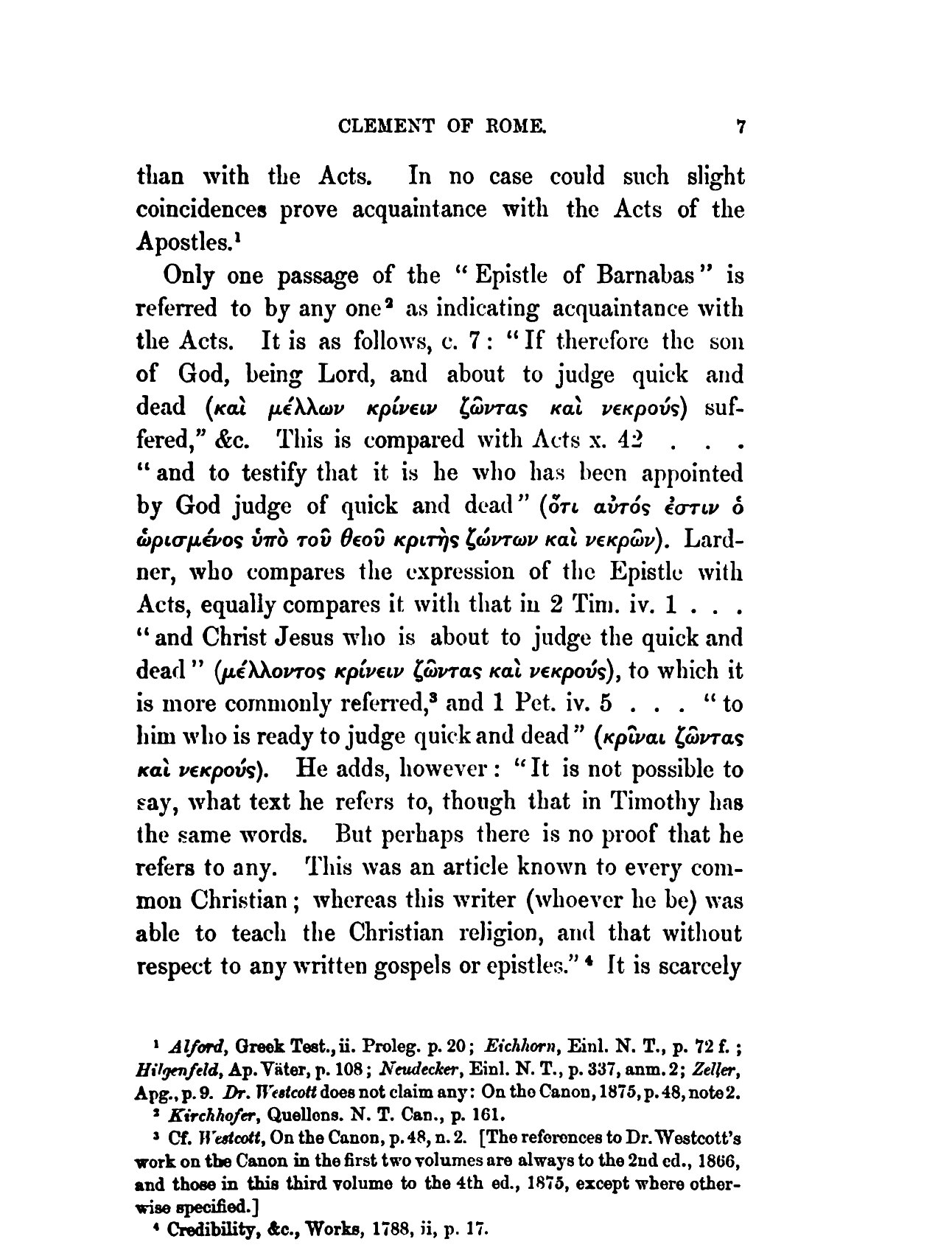 Only one passage of the "Epistle of Barnabas" is referred to by any one(2) as indicating acquaintance with the Acts. It is as follows, c. 7: "If therefore the son of God, being Lord, and about to judge quick and dead [———] suffered," &c. This is compared with Acts x. 42... "and to testify that it is he who has been appointed by God judge of quick and dead" [———]. Lardner, who compares the expression of the Epistle with Acts, equally compares it with that in 2 Tim. iv. 1... "and Christ Jesus who is about to judge the quick and dead" [———], to which it is more commonly referred,(3) and 1 Pet. iv. 5... "to him who is ready to judge quick and dead" [———]. He adds, however: "It is not possible to say, what text he refers to, though that in Timothy has (he same words. But perhaps there is no proof that he refers to any. This was an article known to every common Christian; whereas this writer (whoever he be) was able to teach the Christian religion, and that without respect to any written gospels or epistles."(4) It is scarcely