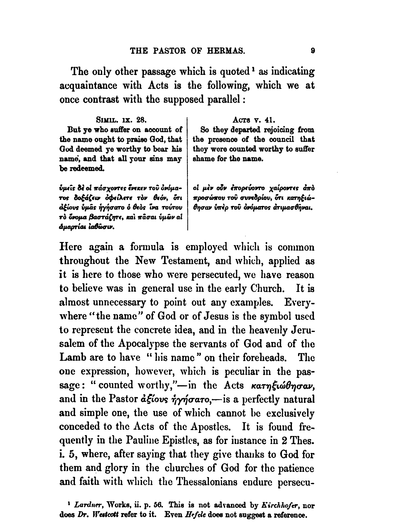 It is asserted that there is a "clear allusion"(2) to Acts in the Pastor of Hermas. The passages may be compared as follows:— [———]