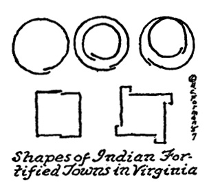 Square towns, like the Nottaway settlement, also in Southampton County, usually measured from two hundred to three hundred feet on a side, and had more than one palisaded entrance. Though not yet proven, it is believed that when the Indians employed "flankers," which are side or corner projections,[5] or bastions, in their walls, as they did upon occasion, they copied them from the English settlers.