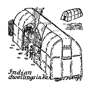 At the native town of Sapponey, Brunswick County, Virginia, there was an interesting variation of the usual town plan. The dwellings were row houses, adjoining one another in the form of a circle. The individual home had palisaded walls, made of large, squared timbers, set two feet deep in the earth and rising seven feet above it. The back walls of such habitations formed the town wall, and there were three entrances into the settlement, formed by leaving passageways about six feet wide between certain pairs of buildings. But the most unusual feature was that the abodes possessed pitched or gable roofs, built with rafters. Upon the rafters hickory bark strips were set so closely together that no rain could penetrate.