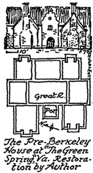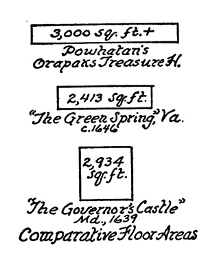 The first chapter in Virginia's architectural history—the Indian chapter—is one of which we may be proud, because, in spite of its widespread perishable nature, the architecture was well-designed, beautifully ornamented, and often of great size and dignity. It,[16] too, sometimes revealed the native's inventive tendencies. No one can relegate with justice the status of Indian architecture to a lower place when the Orapaks Treasure House of Powhatan had a larger floor area than that of the greatest mansion of all Virginia in the seventeenth century—Sir William Berkeley's home, "The Green Spring," near Jamestown—which is shown in our diagram without the "ell" addition. Even with the "ell" included, the Orapaks Treasure House was larger. Moreover, this Treasure House was more extensive in ground space than the largest English house of its time in the American colonies—Lord Baltimore's "Governor's Castle," St. Mary's City, Maryland, of 1639.