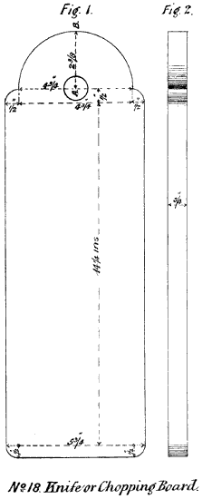 This especially involves straight and square planing. Cut from Deal a piece 20 in. long, 61⁄2 in. wide, and 1 in. thick. Plane [53]one side perfectly level and one edge perfectly straight at right angles. Gauge and mark for width at 53⁄4 in. Find and mark the centre line A to B in Fig. 1 of drawings No. 18. Set the compasses to a radius from A to B, and describe, with A for the centre, the semicircle shown at the top of the Fig. Fit a 1-in. Centre-bit to the Brace, and drill a hole with A for the centre, taking care that it goes vertically through at right angles, and that there is no splitting when the bit is nearly through. With the small turning saw, cut round the semicircle at right angles, and, with the chisel, shave off and round the two corners that spring from the semicircle, also at right angles. Then, measuring from the centre of the rounded end at B, mark the entire length at 167⁄8 in., and, with the tenon saw, cut off at the mark at right angles. Then shave and round at right angles the two bottom corners. Plane the bottom edge smooth, and file the edges where necessary. Set the gauge at 3⁄4 in., mark with it the edge all round for thickness, and plane the rough side down to the mark, perfectly level throughout. Then, with the smoothing plane, take a thin shaving from the first side, merely enough to remove the marks, taking care to maintain an accurate level. Finish throughout with sand-paper.