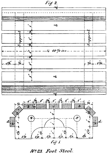 Commencing with the larger piece, plane one side and one edge at right angles. Then gauge-mark to a width of 3 in., and plane the rough edge down to that mark. At the centre of the width draw a line from end, as shown in Fig. 1, f to f. On that line, with compasses, mark the points indicated by a, b, c, of Fig. 1 of the drawings No. 21. At each point drill a 5⁄8 in. hole right through, taking great care to drill vertically. With the square, draw the cross lines at d d, the intersections with the central line forming additional central points. Set compasses to a radius of 7⁄8 in., and, from each of those central points, describe a semicircle as shown in the Fig.; then from each of the same central points describe an outer semicircle as also shown in the Fig. With tenon saw make a nick at each of the four points g, in each case reaching to the outer of the semicircles, each nick being strictly at right angles. Then, with turning saw, follow the line of each of the outer semicircles. Then dress the edges all round with chisel and file as required. Then gauge-mark all round for a thickness of 3⁄4 in., and plane the rough side down to the[62] mark, evenly throughout. Gauge-mark all round for the chamfer, in the proportion shown in Fig. 1, and chamfer to the mark accordingly, using the plane for the sides and the knife for the curves and corners. File throughout where necessary, and finish with sand-paper.