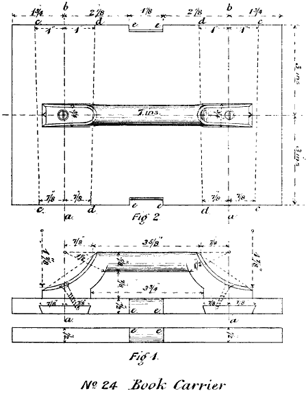 For the handle, cut from Beech a piece 8 in. long, 2 in. wide, and 7⁄8 in. thick. Plane one side and one edge. Then gauge-mark for 11⁄2 in. wide and 3⁄4 in. thick, and plane the rough side and edge down to each gauge-mark. Then draw on one side the diagram of the handle shown in Fig. 1 of drawings No. 24. With[75] the turning saw, cut to the inner and outer lines of the diagram. With the plane, round the top of the handle, as shown in Fig. 1, and, with the knife, round and smooth the other parts, taking care that all the right angles are strictly maintained. Then, with an 1⁄8-in. centre-bit, drill a hole for each screw, as shown in the Fig., and, with the knife, counter-sink for the heads of the screws. With the knife, make the chamfers at the corners of the curves, as shown in Fig. 2, and finish completely with scraper and sand-paper.