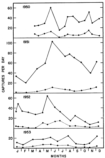 Usually pregnancy can be recognized only in the last week before birth of the litter, when the female's abdomen is noticeably distended by the enlarged fetuses. Palpating to detect embryos was not attempted because of the danger of injuring them or the female. Because gestation is of approximately three weeks duration, the figures in Table 2 represent roughly perhaps one-third, or a little less, of the adult females actually pregnant. At most times of year a substantial proportion of adult females (sometimes nearly all) are pregnant. Only in the winter (including March in 1951) were samples taken in which no recognizably pregnant females were found. Incidence of pregnancy was notably high in July, August, September, and October of 1950, May, 1951, May, 1952, and April and May, 1953. A high rate of breeding was not necessarily followed by an increase in the population. A relatively low rate of breeding was adequate to maintain the population level, provided that environmental factors remained favorable. Fig. 1 shows the average catch per day (with approximately 100 live-traps) over the four-year period, 1950 through 1953. The young (including all those weighing 30 grams or less, and corresponding roughly with the part of the population less than two months old) are shown separately. It is noteworthy that throughout [Pg 142] the entire period the ratio of young to adults tended to be fairly stable—usually fluctuating between ten and thirty per cent of the total catch. Ratios of young to adults were notably high in March and May, 1950; April, June and July, 1952; and April, May and June, 1953. Ratios of young were notably low in June and December, 1950; January, February, March, and June through October, 1951; January, February, and March, 1952; and November, 1953.