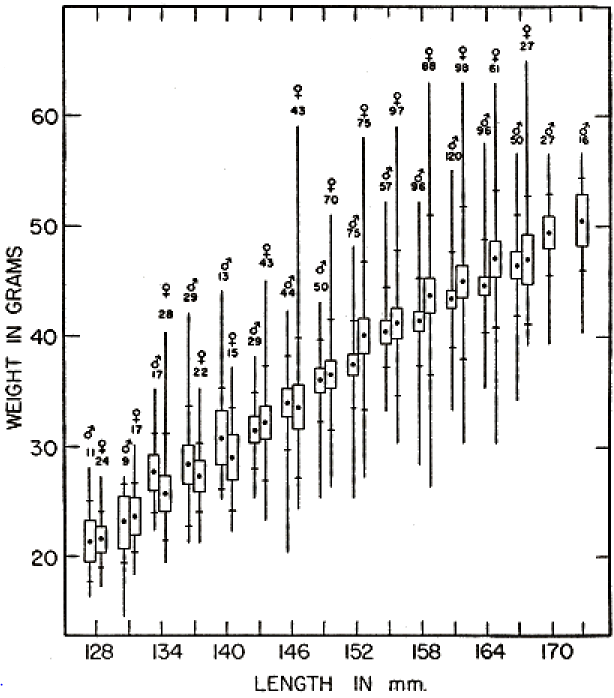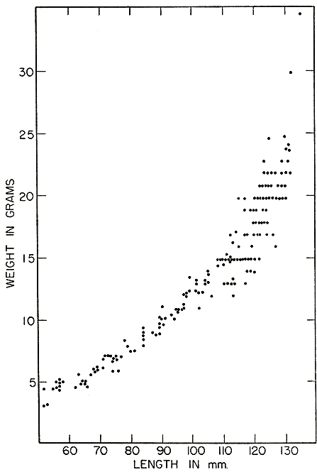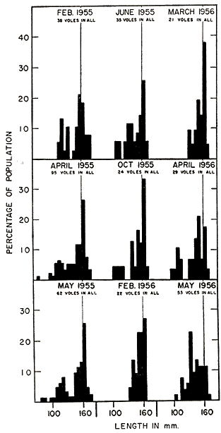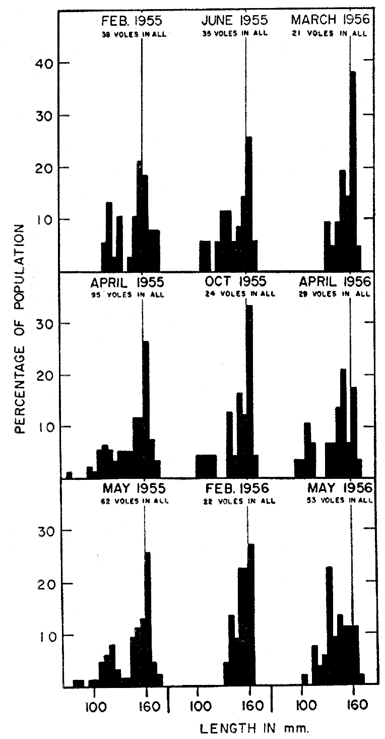 Previous studies of growth in Microtus have been based almost entirely on weights. However, the weight of an individual vole may fluctuate widely over a short period, depending on pregnancy and parturition, length of time in a trap without food, availability of moisture, and other factors. In the course of my study, in 1954 [Pg 132] and 1955, and parts of 1953 and 1956, measurements of total length, in addition to weights, were recorded for most of the voles live-trapped.