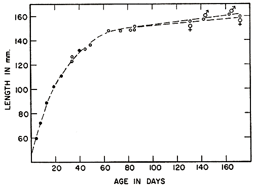 Since rate of growth changes rapidly, with a slowing trend, only those young voles that were recaptured within a few weeks showed the approximate growth rate for any specific portion of the ontogenetic curve. Table 5 summarizes the records of 98 such young sorted into size groups representative of several stages in development. The slowing trend of growth in voles that are nearing subadult size is well shown by these records. Throughout the greater part of the growth curve no difference could be found in rate between the sexes. It is only after sexual maturity has been attained and growth has become relatively slow that males become noticeably larger than females. This tendency for continued growth in the adult males results in a much more marked disparity in size between the sexes in the oldest voles, as evident in Fig. 2.