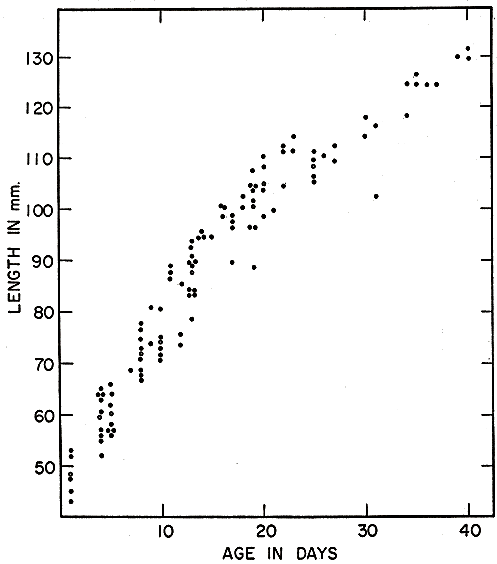 To test the accuracy of measurements, successive readings were compared in individual voles that were already of large adult size and that presumably either had stopped growing or were growing so slowly that the gain was scarcely detectable in the relatively short periods involved. For 200 such readings 33 per cent were just the same as previous records for the same animals, 24 per cent deviated by 1 mm., 22 per cent deviated by 2 mm., 15 per cent by 3 mm., 4.5 per cent by 4 mm., .5 per cent by 5 mm., 1 per cent by 6 mm., and .5 per cent by 7 mm. On the average, successive measurements varied by 1.43 mm., somewhat less than one per cent of the adult vole's total length. Occasional errors of two to four per cent were easily eliminated because for the voles used for growth records, series of measurements were available, with clearly defined trends. The occasional readings that deviated from the general trend for the individual were discarded.