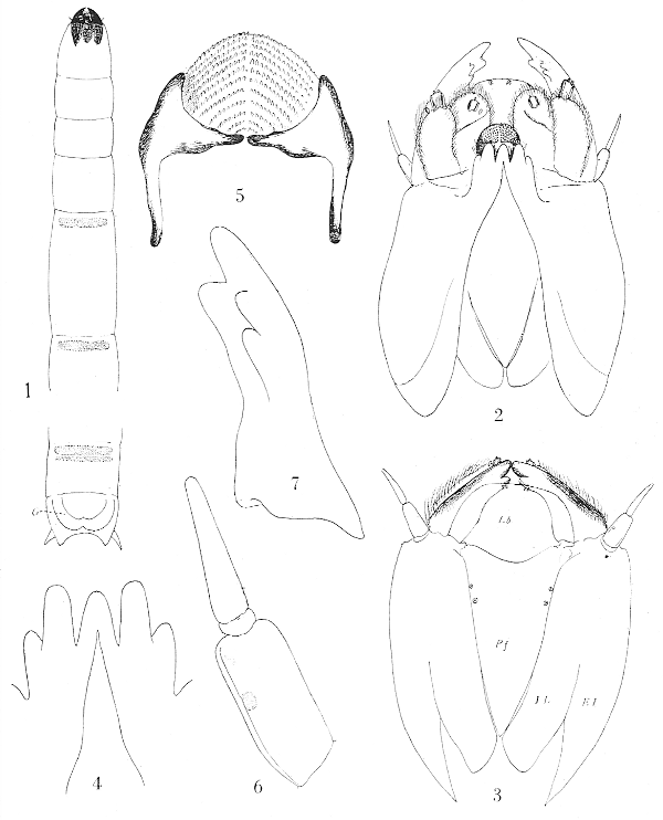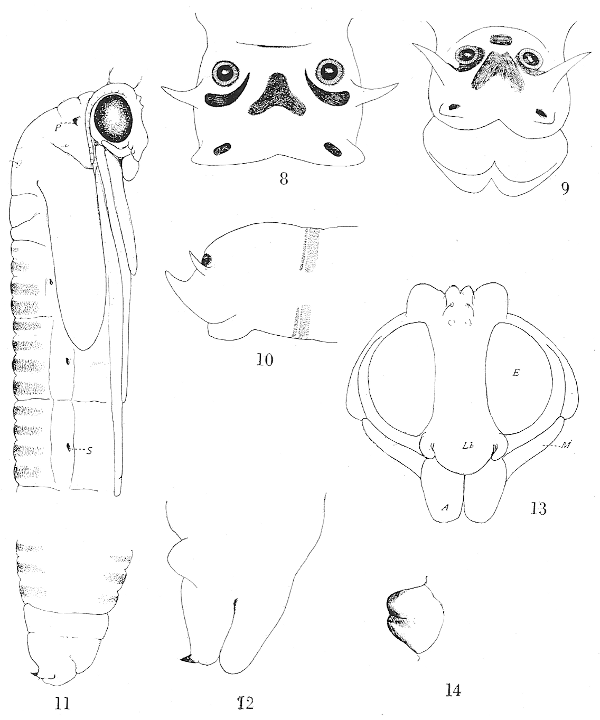 Larva. Form very elongate, terete; integument smooth, glassy, transparent; abdominal segments two to eight with a basal transverse band or area of microscopic chitinized points on the ventral surface; segment eight with a similar band on the dorsum. Spiracular disk surrounded by four lobes, the lateral pair more slender than the blunt ventral pair; dorsal lobe very low or lacking; spiracles small, widely separated; a triangular brown mark on the disk between the spiracles; anal gills a fleshy protuberant ring surrounding the anus. Head-capsule compact, massive, the præfrons large with a few marginal punctures; externo-lateral plates very broad. Labrum large, flattened, pale; antennæ two-segmented, the apical segment almost as long as the basal segment, narrowed to the blunt tip; mandibles with a blunt dorsal and two blunt ventral teeth; maxillæ generalized in structure; hypopharynx a rounded cushion; mentum deeply split behind but not completely divided, with three principle teeth and a small lateral tooth on either side.