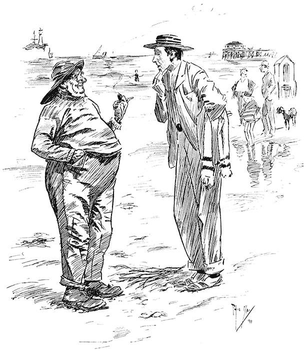 Machine Man (to bather who has been complaining that he was not taken out far enough): "Why, lor bless yer, Sir, I once know'd a man who could dive in two foot of water."