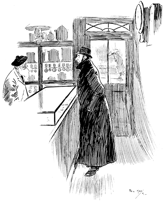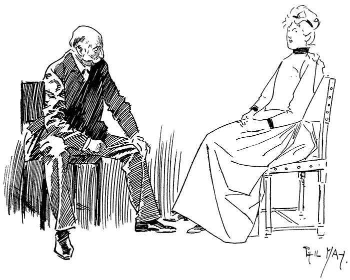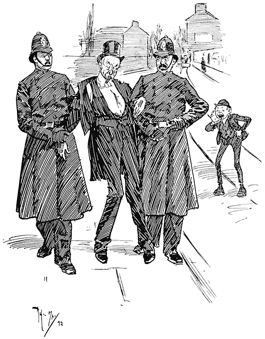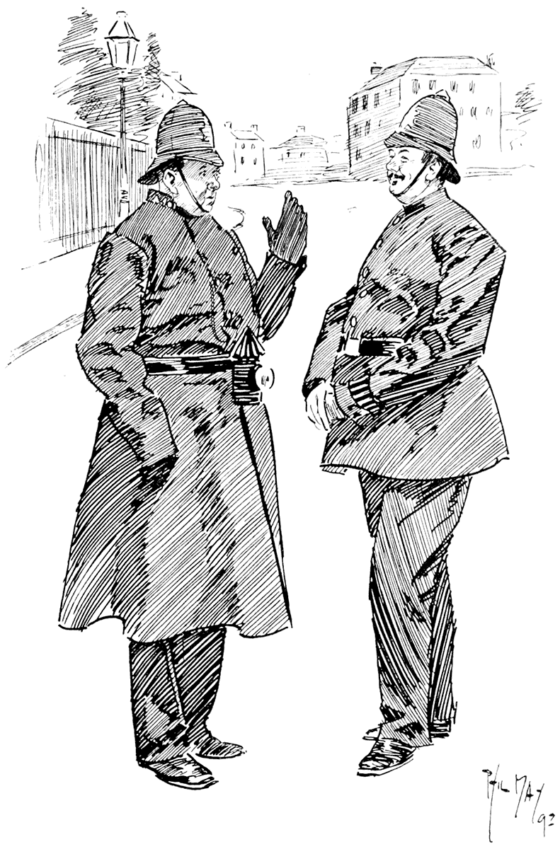 Night Policeman: "Yes, but she's a charwoman, an' is out all day, an' I'm out all night. So we've never met since we came back from our honeymoon."