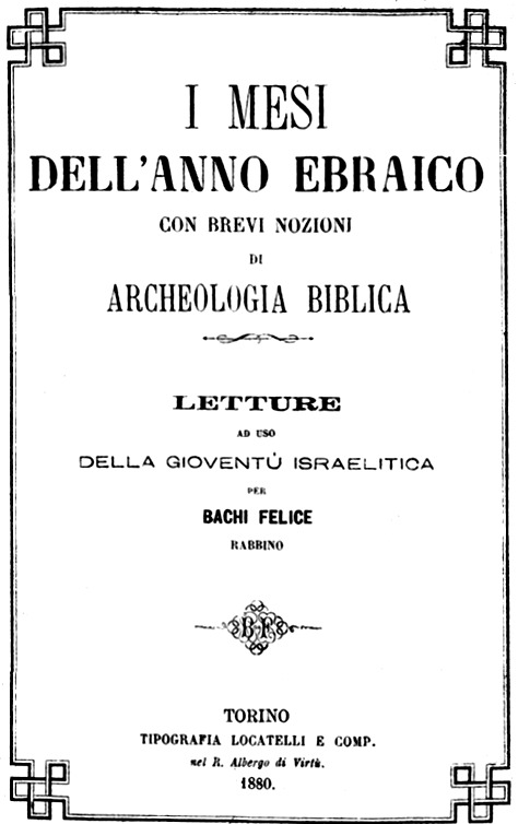 Ma io m'accorgo di escire dal seminato e di essere già ito assai oltre di quanto conveniva per la introduzione del modesto mio lavoro che intitolo: I mesi dell'anno Ebraico; essendo mio scopo segnarvi i fatti più memorabili avvenuti al popolo nostro in ciascun mese, e dei quali come ne serbarono memoria i nostri maggiori, così conviene la serbiamo noi. A complemento poi di questi fatti ho creduto bene di dare alcune fra le più importanti nozioni di Archeologia biblica, distribuendole alla fine di ciascun mese. Vi riescano utili queste letture e valgano ad inspirarvi amore pel giudaismo, ed io mi terrò appieno compensato.