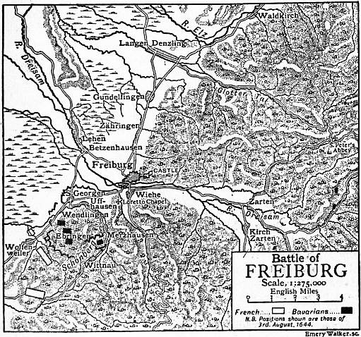 For three days after this the armies lay in position without fighting, the French well supplied with provisions and comforts from Breisach, the Bavarians suffering somewhat severely from want of food, and especially forage, as all their supplies had to be hauled from Villingen over the rough roads of the Black Forest. Enghien then decided to make use of the Glotter Tal to interrupt altogether this already unsatisfactory line of supply, and thus to force the Bavarians either to attack him at a serious disadvantage, or to retreat across the hills with the loss of their artillery and baggage and the disintegration of their army by famine and desertion. With this object, the Army of Weimar was drawn off on the morning of the 9th of August and marched round by Betzenhausen and Lehen to Langen Denzling. The infantry of the Army of France, then the trains, followed, while Enghien with his own cavalry faced Freiburg and the Loretto position.