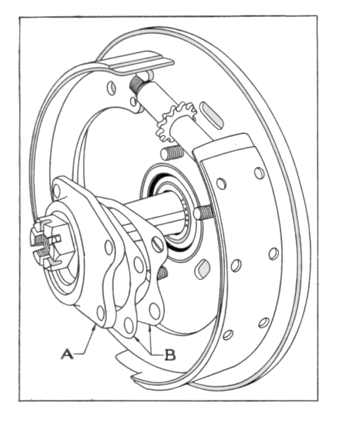 Insert a .014" (.35 mm.) feeler through the inspection hole. Loosen eccentric lock nut "A" and turn eccentric "B" in the direction the wheel rotates when the car is moving forward until the feeler is held snugly between the drum and the lining. Hold the eccentric in this position and tighten lock nut "A." Make this adjustment on all four brakes.