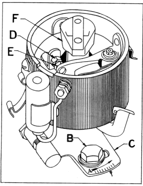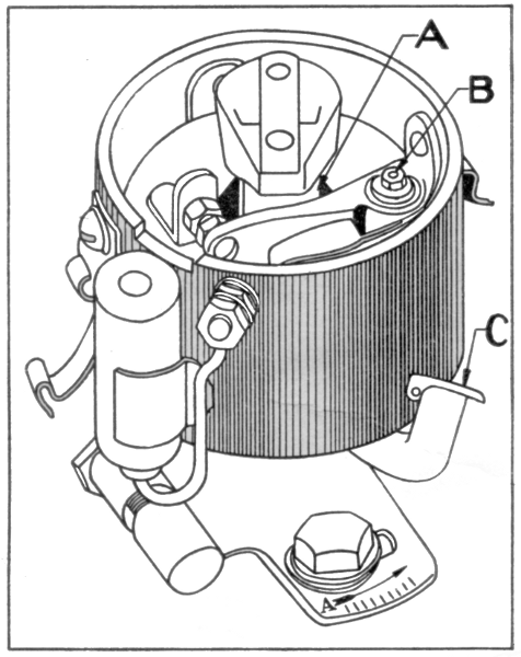 Fill distributor base with oil at cup "C" every 2000 miles. Coat rotor cam "A" with a thin film of vaseline every 2000 miles. Apply one drop (no more) of light oil to breaker arm pivot "B" every 2000 miles. Wipe excess oil and clean distributor head, removing oil or dust before returning to position. Be sure each high-tension terminal and wire on distributor head is pushed as far into its socket as it will go.