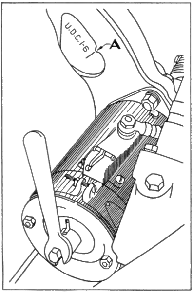Remove the spark plug from number one cylinder. Crank the engine slowly by hand until air is forced out through the spark plug hole. Continue turning the engine slowly until the D.C. 1 and 6 mark is exactly in line with the pointer as shown at "A."