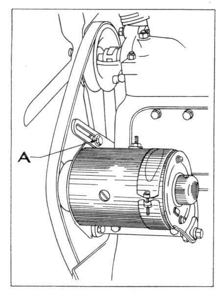 The fan and generator drive belt must be kept at sufficient tension to prevent slippage on the pulleys. Do not adjust too tightly or rapid wear on fan and generator bearings will result. To adjust belt tension, loosen nut "A" and swing generator away from engine to tighten. Then lock adjustment by thoroughly tightening nut "A."