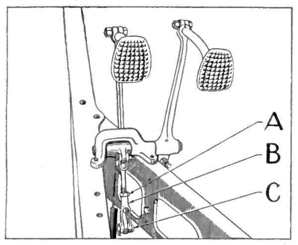 The clutch rod length should be adjusted so that the clutch pedal can be pushed down 1-1/2" before the clearance is taken up between the levers on the clutch cross shaft and the clutch throwout yoke shaft and further movement of the clutch pedal will begin to disengage the clutch.