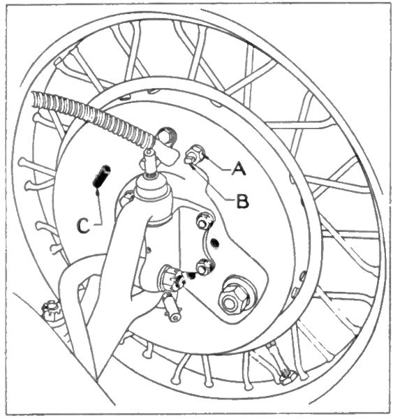 Turn brake drum until inspection hole is 1-1/2" from adjusting screw end of the lining of the lower shoe (rear of front brakes—front of rear brakes). Insert a .008" (.15 mm.) feeler through inspection hole. Insert a screwdriver through opening "C" and turn star wheel until feeler is held snugly. Move the handle of the screwdriver toward the axle to tighten brakes. Make this adjustment on all four wheels.