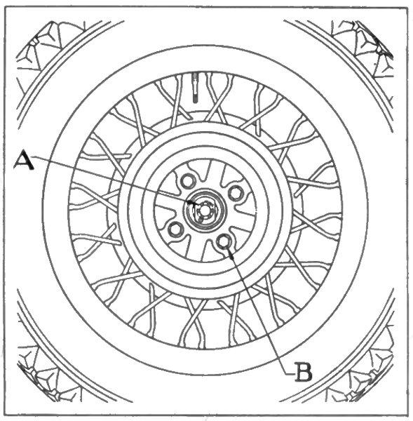To remove a wheel, place a screwdriver between the hub cap and hub and pry off cap. Loosen the four cap screws "B" (illustration top of page) with the socket wrench provided. Remove one cap screw in the lowest position and insert the handle of the wrench through the screw hole into the hub. While holding the wheel in position with the wrench, remove the other cap screws and lift off the wheel. The wheels should be jacked up just sufficiently to clear the ground. When replacing the wheel, place the handle of the wrench through the lower cap screw hole, lift up on the wrench so that the wheel will clear the ground and push in place. Align by moving wrench back and forth. Then start two of the cap screws, remove the wrench and start the remaining two. Tighten every other cap screw until all are down enough to hold wheel in place, making sure it is square on the hub. Continue tightening every other screw until all are secure.