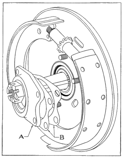 The rear wheel bearings should be lubricated every 5000 miles with No. 3 cup grease. Remove four nuts from bearing cap "A" and remove caps and shims. Pull bearing and after washing bearing and housing in kerosene repack each bearing housing with 1-1/2 ounces of cup grease. Then replace bearings, shims and caps, draw up wheel hub tight on shaft and install cotter pin.