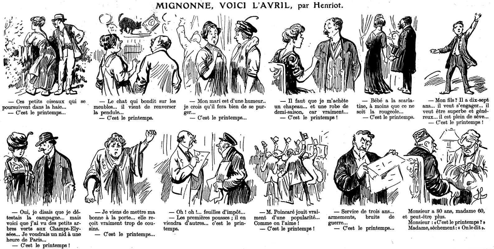 Il y a, dans nos idées et dans nos sentiments, une périodicité merveilleuse et fatale créée par les saisons. Chacune d'elles, à époque fixe, ramène des pensées pareilles dont nous ne pouvons pas plus nous défendre que l'arbre de ses bourgeons. Nous ne sommes pas maîtres de la circulation de nos sèves. Dès la fin de mars, des feuilles sont en nous qui veulent pointer et sortir. Et c'est pourquoi, tous les ans, nous nous étonnons, avec une naïveté qui jamais ne s'épuise, d'éprouver la même impression singulière en lisant un jour sur le calendrier ces deux brusques syllabes: Printemps. Elles éclatent comme une coque.