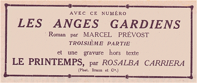 Ce numéro comprend, dans ses vingt-quatre pages, une gravure en taille-douce remmargée avec feuille de garde. Il est accompagné de LA PETITE ILLUSTRATION, Série-Roman n° 3, contenant la troisième partie du roman de M. Marcel Prévost: Les Anges gardiens.