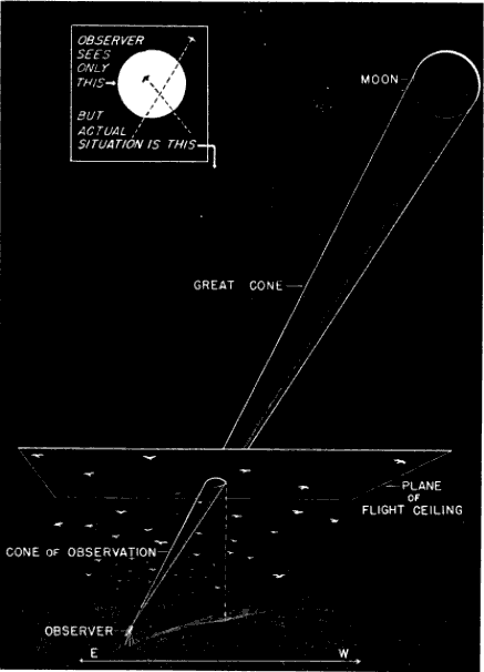 Nor does the moon suit our convenience by behaving night after night in the same way. On one date we may find it high in the sky between 9 and 10 P. M.; on another date, during the same interval of time, it may be near the horizon. Consequently, the size of the cone is different in each case, and the direct comparison of flights in the same hour on different dates is no more dependable than the misleading comparisons discussed in the preceding paragraph.
