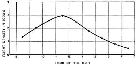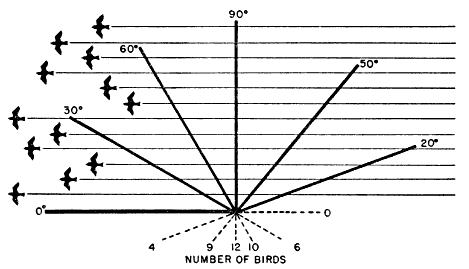 When the count of birds in the cone of observation is used as a sample to determine the theoretical number in a sector passing over such a mile line, the resulting quantity represents what I shall call a Sector Density. It is one of several expressions of the more general concept of Flight Density, which may be defined as the passage of migration past an observation station stated in terms of the theoretical number of birds flying over a one-mile line on the earth's surface in a given interval of time. Note that a flight density is primarily a theoretical number, a statistical expression, a rate of passage. It states merely that birds were moving through the effective field of observation at the rate of so many per mile per unit of time. It may or may not closely express the amount of migration occurring over an actual mile or series of miles. The extent to which it does so is to be decided by other general criteria and by the circumstances surrounding a given instance. Its basic function is to take counts of birds made at different times and at different places, in fields of observation of different sizes, and to put them on the statistically equal footing that is the first requisite of any sound comparison.